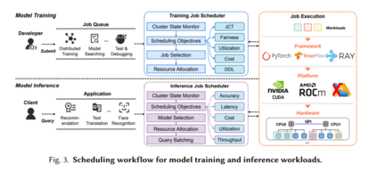 调度器负责确定整个数据中心的资源利用率和每个作业的性能,从而进一步影响操作成本和用户体验[42]。具体来说,(1)对于模型训练,调度器分配用户请求的资源,以支持长时间运行的离线训练工作负载。调度器需要为每个单独的工作负载实现高性能,为整个数据中心实现高资源利用率,并在不同用户之间实现高公平性。由于DL训练工作的特殊性和复杂性,传统的高性能计算(HPC)和大数据负载调度算法会导致资源利用率不均衡和基础设施费用过高[157],需要为GPU数据中心量身定制新的解决方案。(2)在模型推理中,DL应用通常作为在线服务来回答用户的请求。他们通常对响应延迟和推断精度有更高的期望[25,172]。未能在指定时间内完成(服务水平协议)或精度低于预期的应用程序可能很少或没有商业价值。因此,调度器在推断延迟、准确性和成本之间的平衡是至关重要的。