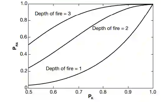 考虑以防空为例。假设有一次NT威胁的突袭。衡量防空性能的一个典型指标是突袭歼灭的概率(PRA)。对于NL层防御,每层都有杀死目标的概率(PK),火力深度的数学优势可以很容易地在一个非常简化的分析中证明。要歼灭整个突击队,必须杀死每一个NT目标,而杀死每一个目标的机会都是NL。简化的分析假设所有这些事件在统计上是独立的,在这种情况下,PRA由PRA=[1-(1-PK)NL]NT给出。