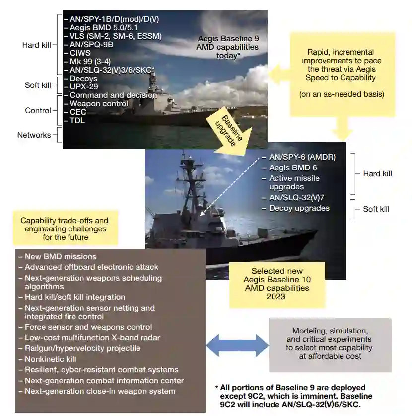 舰艇作战系统是重大投资,随着时间的推移不断发展以实现新的能力。宙斯盾和SDS舰正在进行重大的能力升级,包括重要的新传感器能力。宙斯盾作战系统将从基线9发展到基线10(图2)。这一演变具有许多新的能力。AN/SPY-6防空和导弹防御雷达(AMDR)将提供多任务能力,同时支持对弹道导弹的远程、外大气层探测、跟踪和识别,以及对空中和地面威胁的区域和自我防御。对于BMD能力,需要比目前的雷达系统有更高的灵敏度和带宽,以探测、跟踪和支持在所需范围内对先进弹道导弹威胁的交战,同时对空中和地面威胁进行区域和自卫。对于区域防空和自卫能力来说,需要提高灵敏度和杂波能力,以便在严重的陆地、海洋和雨天杂波的情况下探测、反应和对付紧张的威胁。在控制和交战领域,宙斯盾基线10包括功能升级,以利用AMDR提供的更丰富的数据,如宙斯盾BMD 6在交战弹道导弹时利用AMDR增加的雷达灵敏度和带宽。宙斯盾基线10将利用主动式导弹的持续发展,对不断发展的反舰巡航导弹提供更有效的防御。部署在宙斯盾基线10中的AN/SLQ-32(V)7包括水面电子战改进计划第3块,提供机载电子攻击。软杀伤协调员(SKC)能力是AN/SLQ-32的一个指挥和控制子系统,将被扩展到包括协调机载电子攻击和改进的诱饵库存。