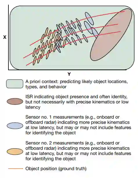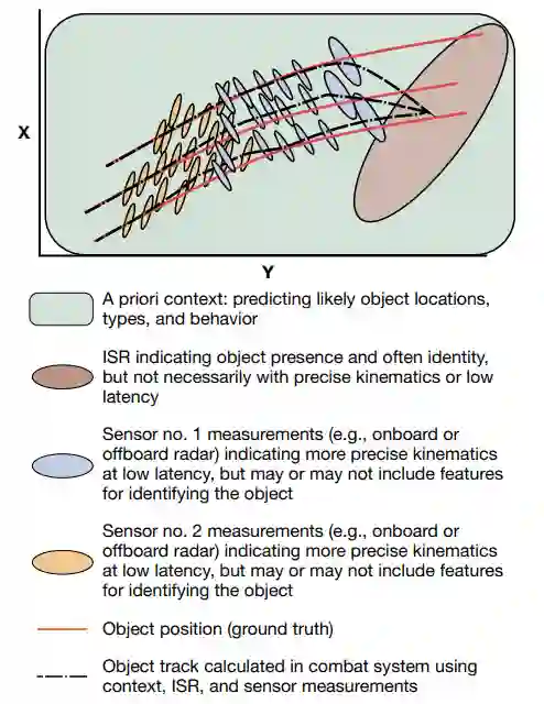 图5说明了关联和跟踪问题。在世界任何地方的任何一天,作战人员一般都有一个先验的背景信息可用。这种背景将定义谁是可能的敌人,他有什么样的威胁,以及,一般来说,他可能如何攻击。在今天的作战系统中,这些信息被视为 "理论",是定义作战系统如何应对传感器信息的规则集合。例如,今天的识别理论定义了,考虑到背景,哪些额外的传感器证据对于最终识别目标是必要的。下一个可能输入作战系统的是来自ISR(情报、监视和侦察)的一些早期指示,即攻击即将来临;这种早期指示提醒作战系统注意物体的存在,并经常识别目标,但它不一定提供精确的运动学或低延迟。今天,几乎没有将背景数据和ISR数据与有机传感器进行定量整合。先验背景和ISR的定量整合是新作战系统设计的一个挑战和增长点。