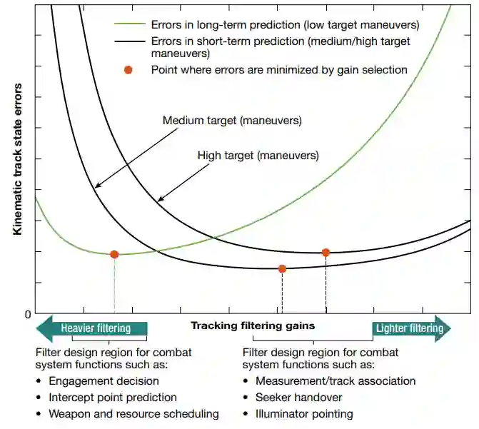 图9. 为了满足交战误差预算,大多数作战系统为不同的作战系统功能以不同的方式处理传感器测量数据。例如,较重的跟踪过滤(较小的过滤增益)将产生运动学估计,由于测量噪声而产生较小的方差,并能进行较长期的时间预测。较轻的跟踪过滤将产生对不可预测的目标运动(机动)更宽容的运动学估计。