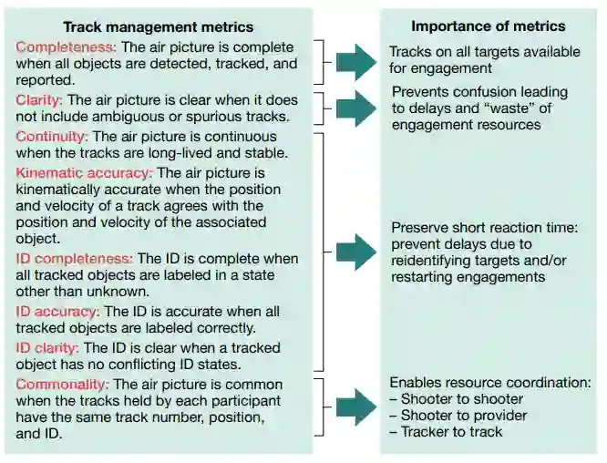 由联合军种(陆军、海军、空军和海军陆战队)为空中轨迹(副弹道导弹)跟踪制定的《单一综合空中图像指标》给出了单一轨迹图像指标的一个好例子(图7)。请注意,这些指标包括轨迹运动学和属性。此外,这些指标还衡量了不同舰艇和飞机上的跟踪图片之间的共同程度。这种共性对共享交战和识别数据至关重要。