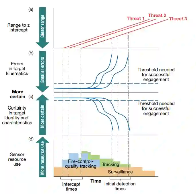 图8. 一个典型的针对突袭威胁的交战序列。一旦探测到目标,就开始收集传感器数据,最终达到足够的运动学准确性和身份及特征的确定性,以实现成功交战。在整个交战过程中,满足这些阈值的传感器资源需求是不同的。