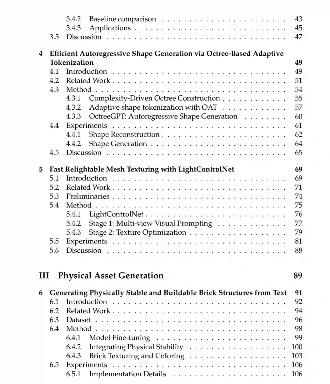 随着虚拟现实(VR)、增强现实(AR)以及其他三维应用的普及,开发能够让普通用户捕获并创建自有三维内容的方法变得愈发重要。然而,当前的三维创作流程往往需要繁琐的人工操作或专门的捕获装置。此外,生成的三维资产常常存在烘焙光照、表示不一致以及缺乏物理合理性的问题,从而限制了其在下游应用中的可用性。 本论文针对这些挑战,提出了一系列利用数据驱动先验的方法,以显著降低三维内容创作的门槛。通过利用来自其他模态的信息、大规模数据集以及预训练生成模型,本文的工作将用户输入的负担降低到仅需随手拍摄的照片、简单的草图和文本提示。 首先,我们展示了深度先验如何帮助用户在无需稠密数据捕获的情况下实现三维场景的数字化,并讨论了如何通过二维用户输入(如草图)实现交互式三维编辑与生成。随后,我们提出了一种端到端的文本到三维(text-to-3D)生成流程,可同时生成三维资产的几何结构与纹理。在几何生成方面,我们提出了一种基于八叉树的自适应分词方案,根据形状复杂度分配表示能力,从而实现更高保真度和更高效率的三维形状重建与生成。在外观建模方面,我们利用数据和扩散模型先验,从文本输入生成可重光照的网格纹理,确保生成的三维对象能够在下游生产工作流中发挥作用。最后,为了使数字设计与现实相结合,我们引入了 BrickGPT,它在文本提示驱动的基础上融入制造与物理约束,从而生成物理稳定、可构建的积木结构。 综合来看,这些工作通过解决几何表示、外观建模和物理感知生成中的核心挑战,架起了用户高层意图与可编辑、可用、并且物理可实现的三维内容创作之间的桥梁。