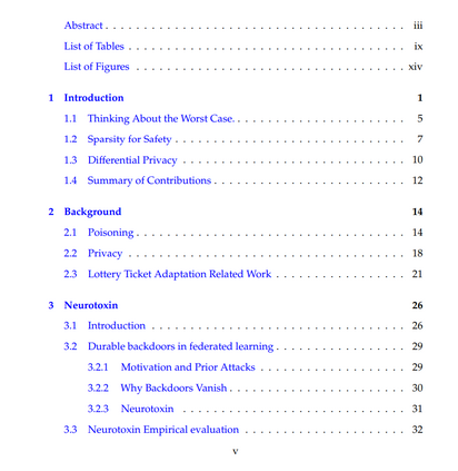 在本论文中,我们将专注于理解AI安全中的最坏情况场景,并探讨基于稀疏性的缓解方法,如稀疏训练。 最坏情况下的AI训练问题源于稀疏性。我们首先在联邦学习(Federated Learning, FL)的背景下考虑对私密数据的适应。由于其分散化的性质,联邦学习系统在训练过程中固有地易受到对抗性后门攻击【Bhagoji et al., 2019】。在这种攻击中,攻击者的目标是通过恶意更新在模型中植入所谓的后门,使得在测试时,模型对某些输入的输出可以被固定为给定目标。在第三章中,我们提出了一种简单的后门攻击修改方案“Neurotoxin”,该方法通过攻击训练中参数变化较小的参数来实施攻击。接下来,我们在拟合模型到用户私密数据的背景下,考虑对私密数据的适应。在这种情况下,我们的主要关注点是理解私密信息如何可能从模型中泄漏。我们首先引入了一组新攻击,这些攻击通过有针对性地设计数据来诱发模型的记忆。在第四章中,我们提出了一种名为“Neural Phishing”的新型攻击,它利用了大语言模型(LLM)中的逐字稀疏性来诱发记忆。我们考虑一种情境,其中攻击者希望模型记住某个用户的未知私密信息,这些信息表现为单个训练样本中的少数几个词元。攻击者能够在模型的训练数据中注入恶意数据。他们设计的序列跨越了用户正常数据分布的支持范围,模型拟合这些数据后,当它看到用户的样本时,只需拟合那些私密词元,因此梯度是逐词稀疏的,模型便记住了这些私密词元。在第五章中,我们介绍了一种LLM的隐私审计方法,这种方法形式化了我们对隐私攻击的直觉。我们的攻击利用了LLM嵌入矩阵更新中的稀疏性,设计出包含在训练数据中极不可能出现的词元模式的诱饵数据,以使嵌入矩阵的梯度稀疏化。 稀疏训练可以缓解隐私和安全问题。在第七章中,我们提出了一种新型防御方法SparseFed,该方法通过全局top-k更新稀疏化和设备级梯度剪辑来缓解联邦学习中的模型中毒攻击。我们为分析防御措施对中毒攻击的鲁棒性提供了理论框架,并对我们的算法的鲁棒性和收敛性进行了分析。在第六章中,我们将稀疏性与隐私的关系应用于差分隐私(DP)模型训练的改进。我们的隐私审计结果显示,模型的最坏隐私损失出现在数据可以诱发稀疏梯度更新的场景中。因此,我们设计了一种方法,通过仅更新低维度的参数集来限制模型的攻击面。我们的方法在DP训练的计算效率、隐私保护和质量方面比之前的工作有了显著提高。在第八章中,我们将稀疏训练用于多种模型适应情境中的安全改进,并提出了“Lottery Ticket Adaptation”方法。我们的方法通过识别“中奖票”,即在将预训练模型适应给定任务时最重要的参数,创建了一个静态稀疏掩码,用于整个训练过程。我们证明了这种稀疏性约束在模型适应过程中可以防止模型学习到有害行为。