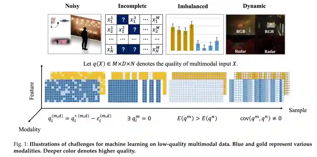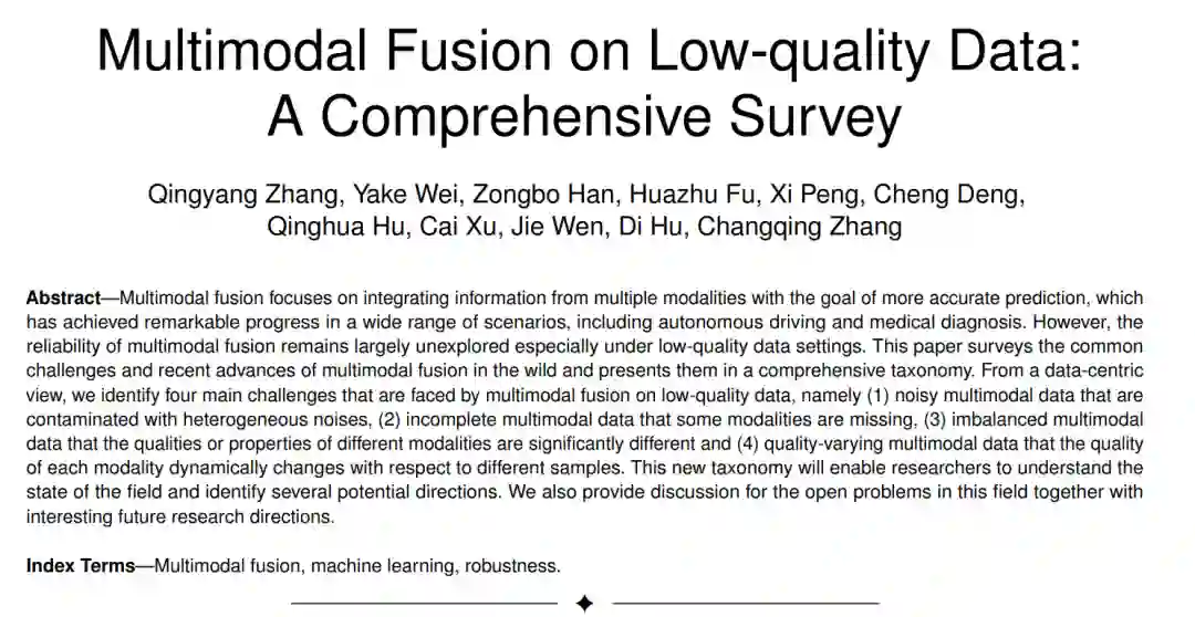 多模态融合致力于整合来自多种模态的信息,目的是实现更准确的预测。在包括自动驾驶和医疗诊断等广泛的场景中,多模态融合已取得显著进展。然而,在低质量数据环境下,多模态融合的可靠性大部分仍未被探索。本文综述了开放多模态融合面临的常见挑战和最新进展,并将它们呈现在一个全面的分类体系中。从数据中心的视角,我们确定了低质量数据上多模态融合面临的四个主要挑战,即**(1)噪声多模态数据,它们被不同种类的噪声污染;(2)不完整的多模态数据,某些模态缺失;(3)不平衡的多模态数据,不同模态的质量或属性有显著差异;以及(4)质量变化的多模态数据**,每种模态的质量会根据不同样本动态变化。这一新的分类体系将使研究人员能够理解该领域的现状,并识别出几个潜在的研究方向。我们还讨论了这一领域的开放问题以及有趣的未来研究方向。