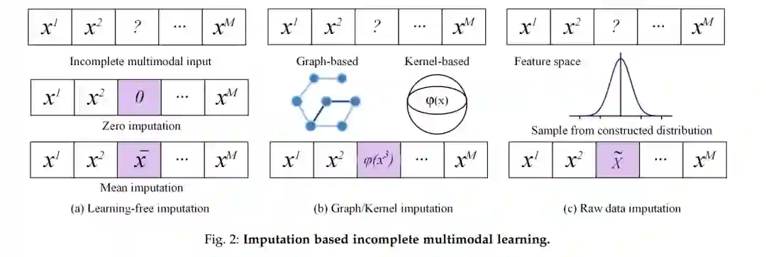在真实应用中收集的多模态数据常常不完整,某些样本的部分模态因意外因素(如设备损坏、数据传输和存储损失)而缺失。例如,在面向用户的推荐系统中,浏览行为历史和信用评分信息可能并不总是对某些用户可用【48】。同样地,虽然结合多种模态的数据,例如磁共振成像(MRI)扫描、正电子发射断层扫描(PET)和脑脊液(CSF)信息,可以为阿尔茨海默病提供更准确的诊断【49】【50】,但由于PET扫描的高测量成本和CSF的不适感侵入性测试,一些患者可能拒绝进行这些检查。因此,在阿尔茨海默病诊断中常见不完整的多模态数据【51】。通常,传统的多模态学习模型假设多模态数据的完整性,因此不能直接适用于部分模态缺失的情况。针对这一问题,旨在探索具有部分缺失模态的不完整多模态数据的信息的不完整多模态学习出现,并在近年来获得了越来越多的研究关注【52】。在本节中,我们主要关注不完整多模态学习研究的当前进展。从是否对缺失数据进行插补的角度来看,我们将现有方法分为两大类,包括基于插补的和无插补的不完整多模态学习,其中基于插补的方法进一步分为两组,如图2所示,包括实例和模态级别的插补。 平衡多模态学习