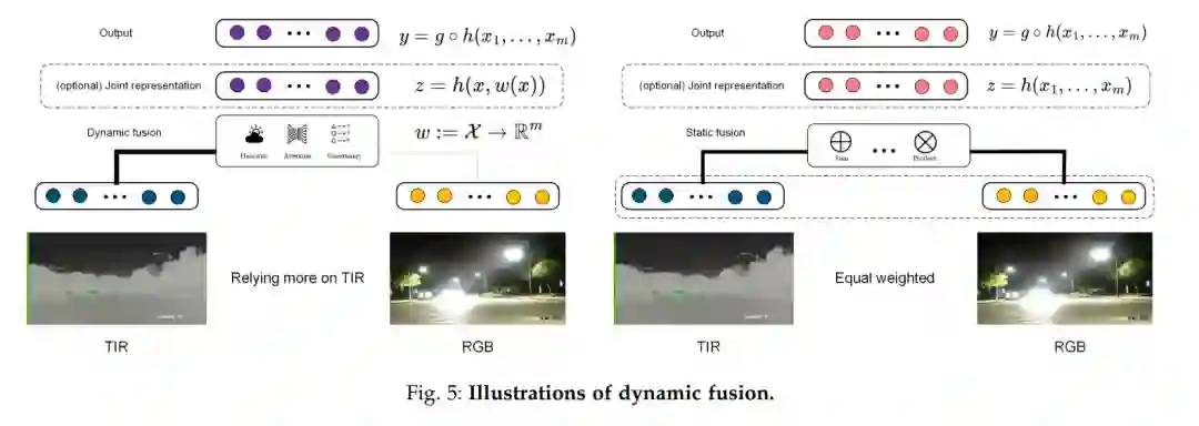 当前的多模态融合方法常基于一种假设,即多模态数据的质量是静态的,这在现实世界场景中并不总是成立的。处理具有动态变化质量的多模态数据是多模态智能系统不可避免的问题。由于意外的环境因素和传感器问题,一些模态可能会遭受可靠性差和丢失任务特定信息的问题。此外,不同模态的质量会根据场景动态变化,如图5所示。这一现象激发了一种新的多模态学习范式,即动态多模态融合,其目标是适应多模态数据质量的动态变化并有选择性地整合任务特定信息。在本节中,我们关注动态多模态融合的挑战,并将当前文献中的进展分类为三个主要方向,包括启发式、基于注意力和意识到不确定性的动态融合。