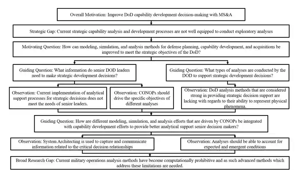 美国国防部(DoD)与兰德公司等研究机构已明确记录了一项战略缺口:现有能力无法开展探索性分析以支持技术研发与作战概念融合的解决方案。探索性分析涵盖多个维度,包括技术发展趋势研判与潜在对手能力的情报评估,而构建模型与仿真推演各类场景,始终是支撑高层决策分析的核心手段。本研究将这一宏观战略缺口分解为若干重点研究领域,首先审视当前整合多模型的既有方法——这些方法在应对国会关于质量、精度与可靠性质询时,因计算资源消耗过大而难以支撑大规模设计或决策空间探索。进一步研究发现,需通过复杂非线性模型量化的性能指标期望值,在不同抽象层级模型间缺乏足够的可追溯性。此外,现有模型抽象方法难以应对复杂系统模型维度激增的挑战。这些观察结论导向本研究的核心目标:提出并验证一种融合降阶建模(ROM)技术的可追溯模型抽象方法,旨在现有军事行动建模与仿真框架内高效捕获复杂体系行为。