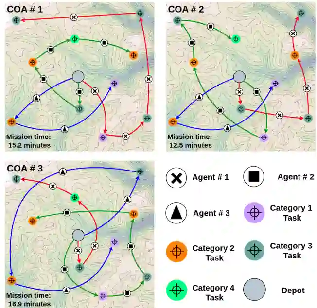 移动协作多智能体系统在灾难响应、环境监测、末端物流、城市空中交通(UAM)、农业自动化及军事行动等领域作用关键。此类复杂行动采用军事规划概念"行动方案"(COA)——预先制定人类/载人载具/自主系统执行任务的调度框架。然而因智能体数量庞大、任务空间动态演变及约束条件持续更新,自动化算法规划需求凸显。加之环境可能在规划与执行间期变化,储备多套备选方案尤为必要。每套方案需保障基础任务效能,同时在资源/任务分配及序列层面保持差异性。图1展示10任务/3智能体场景的3种典型方案。