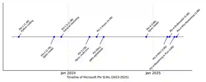 微软Phi SLM家族时间线:从2023年中的Phi-1(专注代码的13亿模型)到2024-2025年的Phi-4系列。早期版本验证小模型可行性,后续版本如Phi-4新增专用推理与多模态能力。