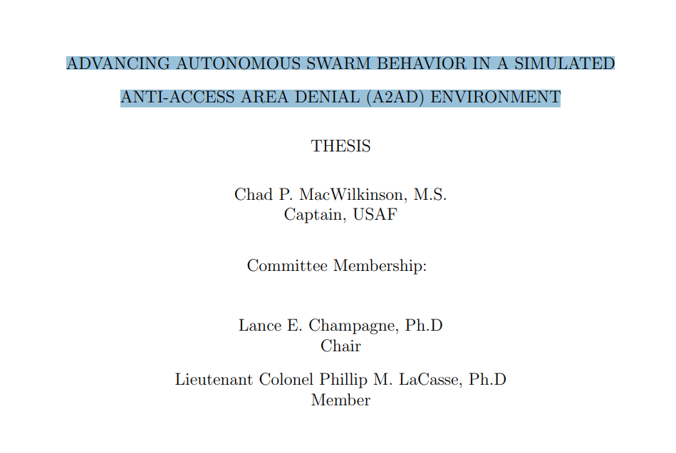 本论文的其余部分安排如下: 第二章回顾了与本研究工作相关的文献。主题包括自主性(分类和应用)、A2AD 环境、建模和仿真以及实验设计 (DOE)。第三章定义了自主性的应用、AFSIM 模型、实验设计以及本研究的有效性衡量标准。第四章通过实验模拟的结果和分析介绍研究结果。最后,第五章得出结论并提出进一步研究的建议。