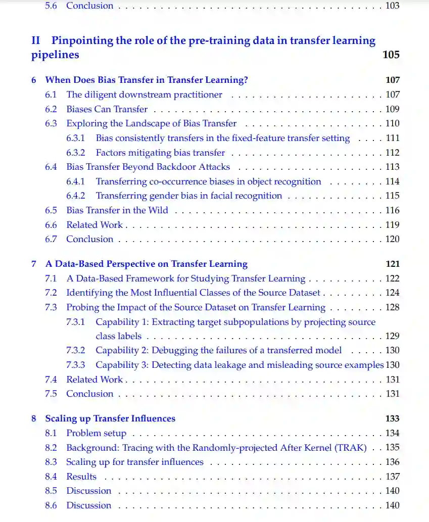 在第二个推动力中,我们调查了预训练数据在迁移学习设置中的作用,其中预训练模型被适应到下游任务。在这里,我们首先探索“偏见转移”的问题,其中来自预训练模型的偏见即使在将模型适应到下游任务后也可以持续存在。然后我们引入转移影响,一个框架用于精确地指出预训练数据点对最终预测的反事实影响。这个框架使我们能够隔离(并移除)预训练数据集中的有害点,以提高迁移学习性能。