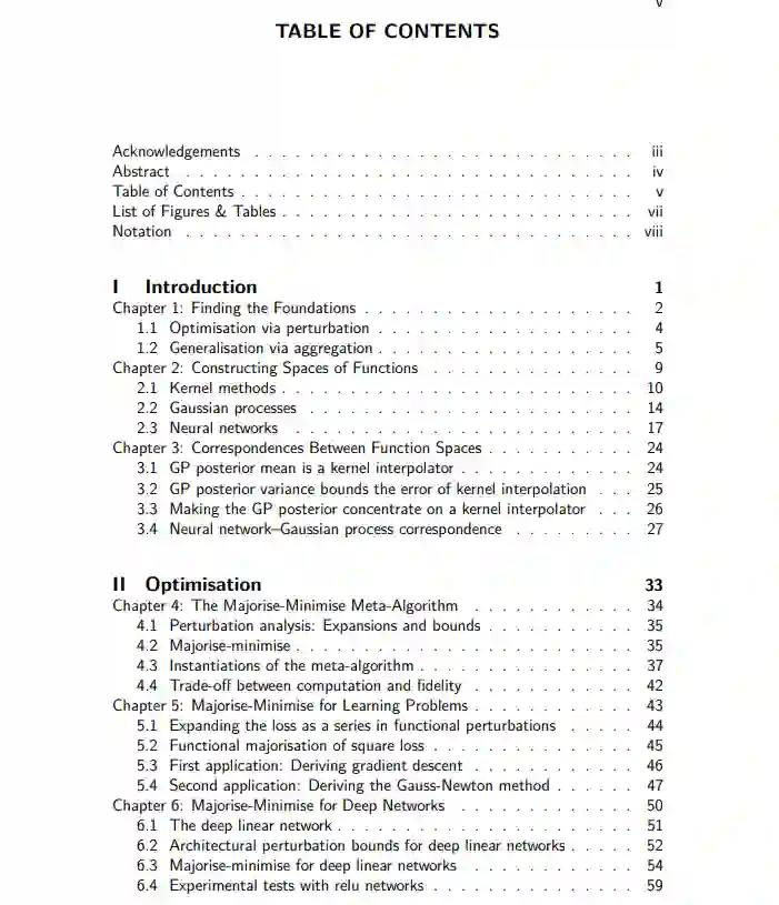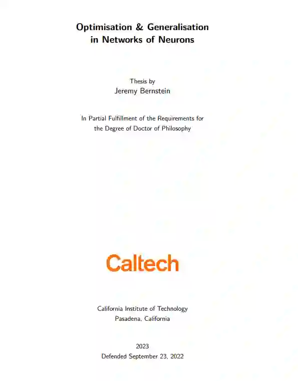 在优化方面,神经网络训练的一个基本特征是,网络权重仅通过其在网络架构中的出现间接影响损失函数。这篇论文提出了一个三步框架来派生新的“架构感知”优化算法。第一步称为函数优化,是根据函数扰动对损失函数的一系列展开进行优化。第二步是推导出体系结构摄动边界,将函数摄动的大小与权重摄动的大小联系起来。第三步是将这些体系结构扰动边界代入损耗的函数多数化,并通过最小化得到优化算法。这构成了主要最小化元算法在神经网络中的应用。在泛化方面,最近的一项有前途的工作是应用PAC-Bayes理论为神经网络推导非空泛化保证。由于这些保证控制了网络集合的平均风险,它们没有解决哪一个单独的网络应该是最好的泛化。为了弥补这一差距,本文重新点燃了核文献中的一个老思想:贝叶斯点机。贝叶斯点机是一个单一分类器,它近似于分类器集合的集合预测。由于聚合减少了集合预测的方差,贝叶斯点机往往比其他集合成员更好地进行泛化。本文证明,当网络宽度和归一化裕度都无穷大时,与训练集一致的神经网络空间集中在贝叶斯点机上。这激发了返回大标准化裕度的广泛网络的实践。这些想法的潜在应用包括不确定性量化的新方法,神经硬件更有效的数值表示,以及在学习问题中传递超参数的优化器。