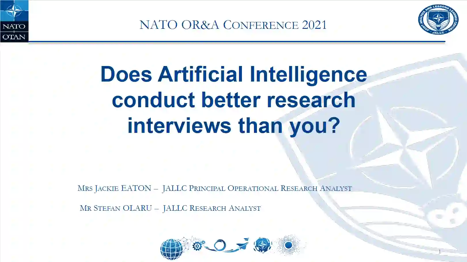 本文的目的是分享和反思JALLC在分析项目中使用新型人工智能驱动的语音机器人获取经验教训(LL)知识的经验。导言部分概述了作为经验教训能力一部分的知识获取需求,新技术在提高经验教训知识获取能力方面的潜力,总结了使用访谈获取经验教训知识的情况,并概述了人工智能和机器学习(ML)如何被纳入不同部门的访谈和调查方法中。分析方法部分介绍了JALLC的分析项目,并解释了JALLC如何为该项目设置访谈。结果部分讨论了JALLC使用AI语音机器人进行访谈的经验,本文最后回答了本文标题中的问题。"人工智能是否比你进行更好的研究访谈?"总结了优点、缺点,以及北约在未来使用这项新技术时需要考虑的问题。