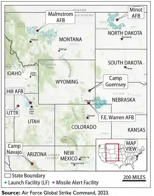 美空军计划采购 634 枚 "哨兵 "导弹,加上另外 25 枚用于支持开发和测试的导弹,以部署 400 枚导弹。据空军称,该计划还包括对 "450 个发射井和 600 多处设施进行现代化改造,总面积近 40,000 平方英里"(见图 1)。