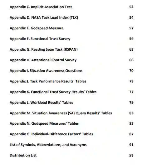尚待探讨的是,人类与智能体通信的能力(即改变目标和动机以及保存资源)将如何影响人类对所述智能体的看法、对智能体的信任以及智能体的态势感知。不可避免的是,当智能体被部署在下马队中时,组长将有能力和必要向智能体传达不断变化的目标和指令。当务之急是事先了解这种双向通信的结果,以了解和避免(在可能的情况下)在战场上可能遇到的潜在困难。