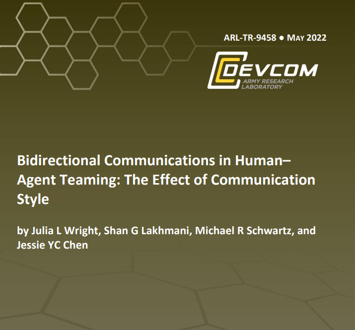 尚待探讨的是,人类与智能体通信的能力(即改变目标和动机以及保存资源)将如何影响人类对所述智能体的看法、对智能体的信任以及智能体的态势感知。不可避免的是,当智能体被部署在下马队中时,组长将有能力和必要向智能体传达不断变化的目标和指令。当务之急是事先了解这种双向通信的结果,以了解和避免(在可能的情况下)在战场上可能遇到的潜在困难。