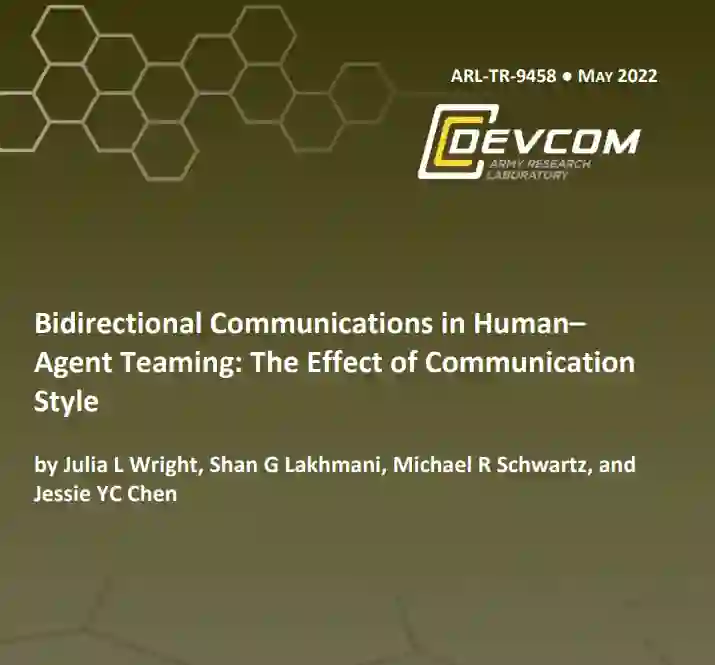 在人类-智能体团队中,信息共享的方式由界面设计决定(Kilgore和Voshell 2014),其中一个方面将是团队成员的通信风格。机器人是简单地分享关于其状态和对周围环境的信念的信息(单向通信),还是团队成员有能力相互查询,更新目标和纠正错误信息(双向通信),这不是由团队决定的,而是由界面内置的能力决定的。因此,在某种程度上,人类对智能体的看法可能不是由智能体的任务表现或能力决定的,而是由团队部署前很久做出的设计决定决定的。在这项工作中,将评估通信方式对人类的任务表现、SA、感知的工作量、信任和对自主智能体的看法的影响。此外,还将评估可能影响调查结果的几个个体差异因素。