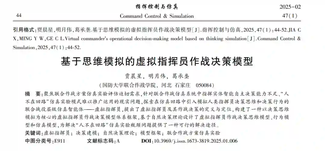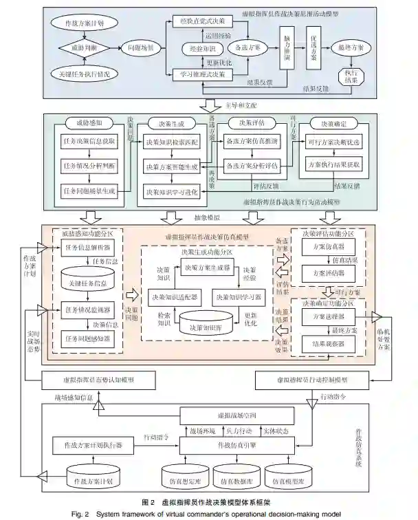 聚焦联合作战方案仿真实验评估迫切需求,针对联合作战仿真系统中指挥实体智能自主决策能力不足、“人 不在回路”仿真实验模式难以推广运用的现实问题,探索在仿真回路中引入模拟人类指挥员决策思维和决策行为的 联合战役层级仿真智能体———虚拟指挥员,提出了虚拟指挥员及其作战决策的定义与定位,构建了一种以决策思维 模拟为核心的虚拟指挥员作战决策模型体系框架,基于自然决策理论设计了虚拟指挥员作战决策思维模型、行为模 型和仿真模型,为解决“人不在回路”仿真实验瓶颈问题提供了一种可行的解决途径。