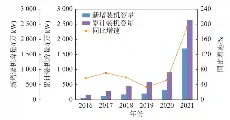 相较于海洋油气资源,海上风力资源的开发利用在我国起步较晚。我国首座规模型海上风电场东海大桥100MW项目直至2010年才正式运行。由于起步较晚,海上风电在我国仍是一种区域性的补充能源,仅占全国装机总量的1.2%。而海上风电在英国等风电强国已经成为了一种重要的替代能源,一些国家甚至开始尝试海上风电制氢,将过剩的风电能源转化成清洁化学能源进行储存。虽然海上风力发电在我国总体能源结构中份额很低,但其增长率与体量均居世界前列。受益于国家能源局《风电发展“十三五”规划》(国能新能〔2016〕314号)、国家发改委《关于海上风电上网电价政策的通知》(发改价格〔2021〕833号)等一系列支持政策,我国海上风电装机同比增长率在“十三五”期间始终保持在15%以上(见图7)。2021年,我国海上风电新增装机更是达到1690万kW,累计装机突破2639万kW,跃居世界首位。随着我国2060年前实现碳中和历史性目标的确立,可以预见海上风力发电将进入新一轮高速增长期,对我国能源体系的贡献度将进一步增大。 注:数据来源于国家能源局图7 2016年至2021年我国海上风电增长 海上风电在高速增长过程中,也逐渐呈现出一些发展趋势: **(1)机组大型化。**机组大型化是海上风电进一步提高单机功率、降低发电成本的必由之路,这一点已在业界取得共识。中国可再生能源学会公布的数据显示,我国海上风电平均单机容量在“十三五”期间由3.8MW增至4.9MW。一些风电厂商已经开始研制超大容量海上风电机组,例如东方电气在2021年底公布了拥有完全自主知识产权的海上13MW级机型。 **(2)深远海布局。**深远海风电场风能密度高、选址限制因素少,在近海风力资源开发日趋饱和的背景下将成为海上风电产业下一阶段的发力点,加大漂浮式风机技术研究势在必行,我国首个漂浮式海上风电机组“三峡引领号”于2021年成功并网发电(见图8)。国家发改委和国家能源局发布的《“十四五”现代能源体系规划》(发改能源〔2022〕210号)中明确指出要推进海上风电向深水远岸区域布局。 **(3)海洋资源一体化开发。**对海上风电、海洋牧场、绿色制氢等海洋资源进行综合开发利用有助于平摊成本,甚至可以实现多能互补。一些沿海省份已经出台政策鼓励对海洋资源一体化利用的探索。广东省人民政府办公厅印发的《广东省海洋经济发展“十四五”规划》(粤府办〔2021〕33号)提出,支持海洋资源综合开发利用,推动海上风电项目开发与海洋牧场、海上制氢、观光旅游等相结合。