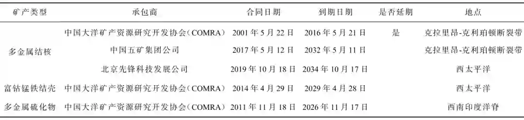 注:图片来源于Hein和Koschinsky 图11 海底矿产与分布 《中共中央关于制定国民经济和社会发展第十四个五年规划和二〇三五年远景目标的建议》中,多次提到深海资源开采相关科研和产业。2021年9月,中国工程院院士金东寒在中国工程科技发展战略天津研究院重大咨询研究项目“新形势下深海采矿战略研究”启动会致辞中表示:深海采矿是我国深海战略的重要组成部分,深入研究我国深海采矿战略,对于我国加快建设海洋强国,实现高水平科技自立自强具有重要意义。至今,我国在国际海底共申请了五块矿区勘探权(见表3)。根据联合国海洋法公约及其相关文件,享有优先开采权。然而,我国在深海资源开发技术研发领域起步较晚,作业水深达6000m的矿产资源开发更需要大力创新和技术跨越式升级。