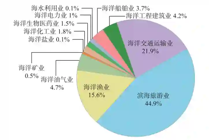 总体而言,以美国和欧洲为代表的先进海洋工程发展水平在产业规模、产业综合竞争力、国际市场占有率、政策支撑等方面具有明显优势,主要体现在:⑴规范体系具有话语权,从根本上引领了全球海洋工程装备设计、建造的技术标准核心;⑵设计分析理论体系相对完善,针对海洋工程基础共性问题发展了科学可靠的工程分析理论和运维保障技术;⑶具备自主知识产权的设计分析工具和分析理论,几乎垄断了高端海洋工程产品研发核心技术和主流的海洋工程分析软件。 与国外高精尖海洋工程装备和成熟的技术体系相比,我国海洋工程从浅水开始起步,正逐步寻求深水海域的布局与突破。为实现海洋工程装备与技术的快速发展,“十一五”以来,我国出台了一系列与海洋资源开发及其配套装备产业发展相关的国家战略和政策,以国务院发布的《国家重大科技基础设施建设中长期规划(2012—2030年)》(国发〔2013〕8号)为核心,指出要大力发展海洋探测、资源开发利用、海上作业保障装备及其关键系统和专用设备,为国家海洋安全、资源/能源开发、环境监测和灾害预警预报等提供支撑。在第十二届全国人大第四次会议审议通过的《中华人民共和国国民经济和社会发展第十三个五年规划纲要》中明确提出“拓展蓝色经济空间,发展海洋经济,科学开发海洋资源”的总体规划,国家发展改革委和原国家海洋局发布的《全国海洋经济发展“十三五”规划》(发改地区〔2017〕861号)将“推进海洋产业优化升级”确立为海洋经济发展的重点任务,国务院发布的《中国制造2025》(国发〔2015〕28号)更是将海洋工程装备制造业确定为十大重点领域之一,成为我国战略性新兴产业的重要组成部分和高端装备制造业的重点发展方向。 在国家政策指引下,我国加大了海洋开发装备的投入,紧紧围绕制约行业发展的关键技术瓶颈开展攻关,“海洋石油981”“海洋石油982”“蓝鲸1号”半潜式钻井平台、“海斗一号”“奋斗者号”深潜器、“东方红3号”科学考察船、“鲲龙500”海底集矿车、“天鲲号”自航绞吸船、“铁建风电01”重型风电安装船等“大国利器”成功研制,实现了我国深海、远海作业从零起步到跟跑、并跑,甚至在某些方面领跑的跨越式发展,诸多主力装备实现批量化建造,逐渐在全球海洋探测与开发方面具有竞争力和话语权。 当前,我国海洋工程装备与技术的发展呈现着良好的势头,深海开发能力初步形成,已经具备全链条海上作业能力,一定程度上缩小了我国与发达海洋国家在装备技术上的差距。尽管如此,在推动海洋工程向高端、高质量发展的进程中,我国目前还处于“萌芽”状态、基本停留在“空白”阶段,与国际先进水平相比尚存在较大差距,主要体现在: **(1)海洋工程产业的引领作用薄弱。**我国历年海洋生产总值占全国GDP比重不足10%(见图3),以海洋化工业、海洋新能源、海洋船舶工业、海洋工程建筑等为代表的海洋工程产业体量依然很小(见图4),产业结构和区域布局均处于优化调整和转型升级阶段。 **(2)海洋工程科技自主创新和转化能力不足。**我国海洋工程科技创新链、技术链、产业链不完整,对海洋工程中的核心耦合机制、力学行为的理论描述、数值预报、设计准则的探索和分析依然有限,关键技术难题的把握和认识严重不足,制约着新型高端海洋工程装备研发与应用。根据2020年发布的全球海洋科技创新指数报告(2020)显示,我国海洋科技创新指数位于全球第二梯队,与世界领先水平仍有较大差距。同时,我国海洋工程科技创新缺乏有效的成果转化机制,成果应用机构与研究机构结合不紧密,人才比例、创新体系均有待进一步完善。 **(3)海洋调控管理体制机制不完善。**在海洋管理方面,仍存在“政出多门、多头指挥”的现象,海洋、渔业、环保海事等多个部门对海洋产业内事务重复交叉管理。加之政策措施协调不足,现有的产业扶持政策实施中缺乏部门协调,使得政策效应难以充分发挥,海洋工程相关企业缺乏基本的制度保障,在培育和管理模式方面都落后于国外。 注:数据来源于《中国海洋经济统计公报》图3 2015年至2021年中国海洋产业产值比例
