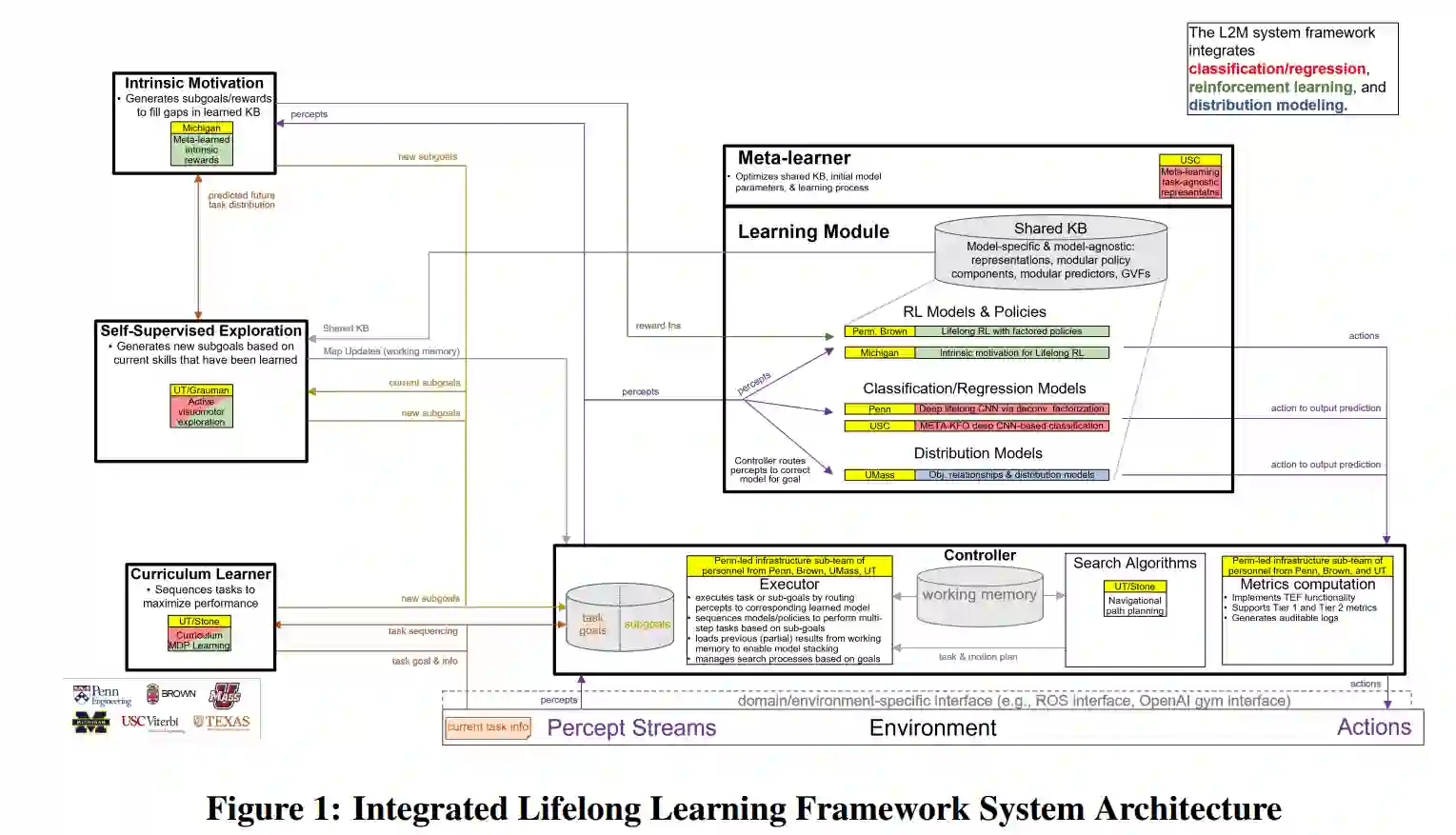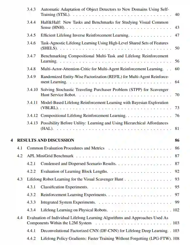 在DARPA终身学习机器(L2M)项目下,我们探索了一种自主系统终身学习的综合方法,解决了不同任务间的持续学习和迁移、可扩展的知识维护、自我导向的学习以及对具身智能体变化环境的适应等基本问题。我们的L2M方法的关键方面包括:感知和行动的持续学习,不同任务之间的迁移,可扩展的终身知识维护,自主发现的自我导向学习,以及任务的非平稳分布建模。我们分别探索了这些方面,为分类和强化学习设置开发了各种终身学习算法。然后,这些开发的算法通过模块化框架整合在一起,产生了一个同时支持分类和强化学习任务的L2M系统。