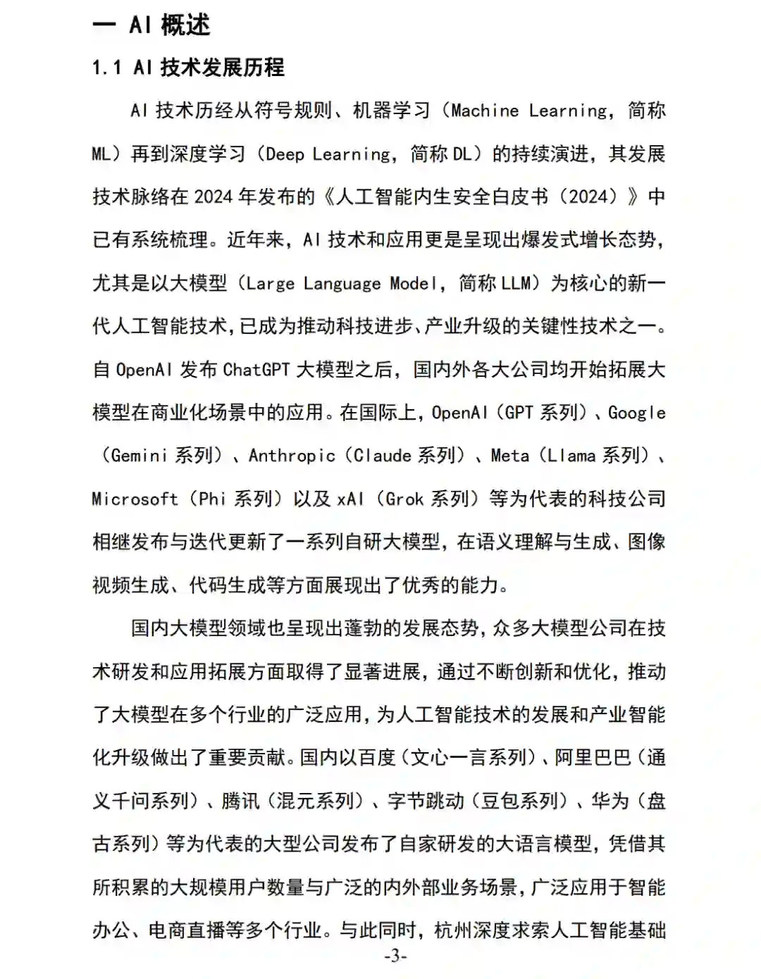 1.1AI技术发展历程 AI技术历经从符号规则、机器学习(MachineLearning,简称ML)再到深度学习(DeepLearning,简称DL)的持续演进,其发展技术脉络在2024年发布的《人工智能内生安全白皮书(2024)》中已有系统梳理。近年来,AI技术和应用更是呈现出爆发式增长态势,尤其是以大模型(LargeLanguageModel,简称LLM)为核心的新一代人工智能技术,已成为推动科技进步、产业升级的关键性技术之一。 自OpenAI发布ChatGPT大模型之后,国内外各大公司均开始拓展大模型在商业化场景中的应用。在国际上,OpenAI(GPT系列)、Google(Gemini系列)、Anthropic(Claude系列)、Meta(Llama系列)、Microsoft(Phi系列)以及xAI(Grok系列)等为代表的科技公司相继发布与迭代更新了一系列自研大模型,在语义理解与生成、图像视频生成、代码生成等方面展现出了优秀的能力。 国内大模型领域也呈现出蓬勃的发展态势,众多大模型公司在技术研发和应用拓展方面取得了显著进展,通过不断创新和优化,推动了大模型在多个行业的广泛应用,为人工智能技术的发展和产业智能化升级做出了重要贡献。国内以百度(文心一言系列)、阿里巴巴(通义千问系列)、腾讯(混元系列)、字节跳动(豆包系列)、华为(盘古系列)等为代表的大型公司发布了自家研发的大语言模型,凭借其所积累的大规模用户数量与广泛的内外部业务场景,广泛应用于智能办公、电商直播等多个行业。与此同时,杭州深度求索人工智能基础技术研究有限公司开发的大模型DeepSeek备受关注。DeepSeek模型性能比肩国际领先水平,训练成本极低,同时采用开源策略,极大地推动了AI技术的普及。更重要的是,DeepSeek的崛起对整个AI行业格局产生了深远影响,为未来AI技术发展提供了新思路和巨大潜力。 未来,大模型技术将持续深化发展。在技术架构层面,通过并行计算、软硬件协同等技术支撑,实现计算效率的跃升。在应用拓展层面,大模型服务将走向多领域应用,具备更强的泛化能力和自我进化能力。同时,随着各行各业纷纷布局大模型应用服务,安全性、可靠性、可控性也将成为大模型能力发展的重要考量。