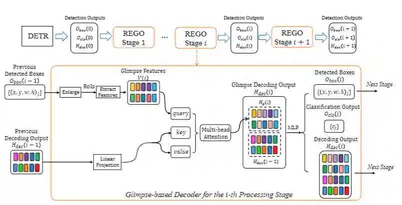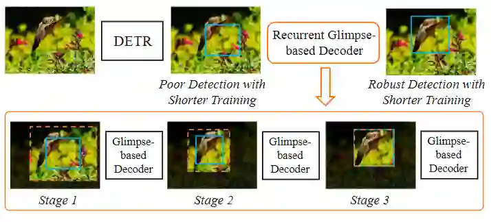 不同于目前的方法,我们发现有关可能包含物体的兴趣区域(region-of-interest)信息能直接、简单、有效地帮助缩短需要的训练周期。具体来说,我们试图模仿人类的视觉感知过程并借助类似于“瞥视”的行为获取有关物体位置的大致信息,然后通过一个多阶段递归的处理过程,帮助模型逐渐地聚焦到正确的物体区域,从而较大程度上降低模型进行目标检测的难度,减少其所需的训练周期。依此,在本文中,我们提出了一个利用递归“瞥视”解码器的方法来利用兴趣区域信息,从而有效加速基于Transformer的目标检测算法。