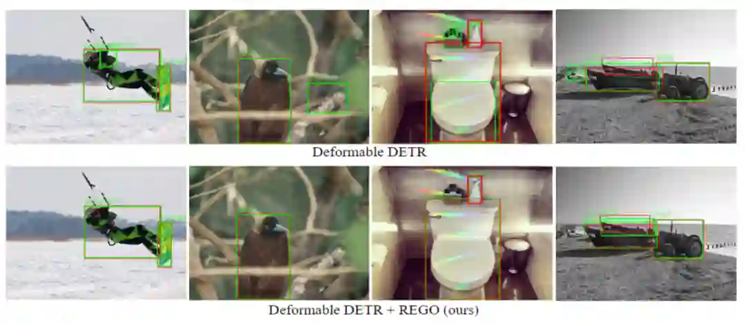 图 4 我们的方法(REGO)和原始方法(Deformable DETR)检测结果可视化