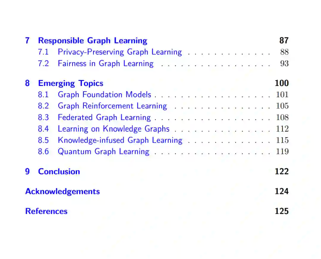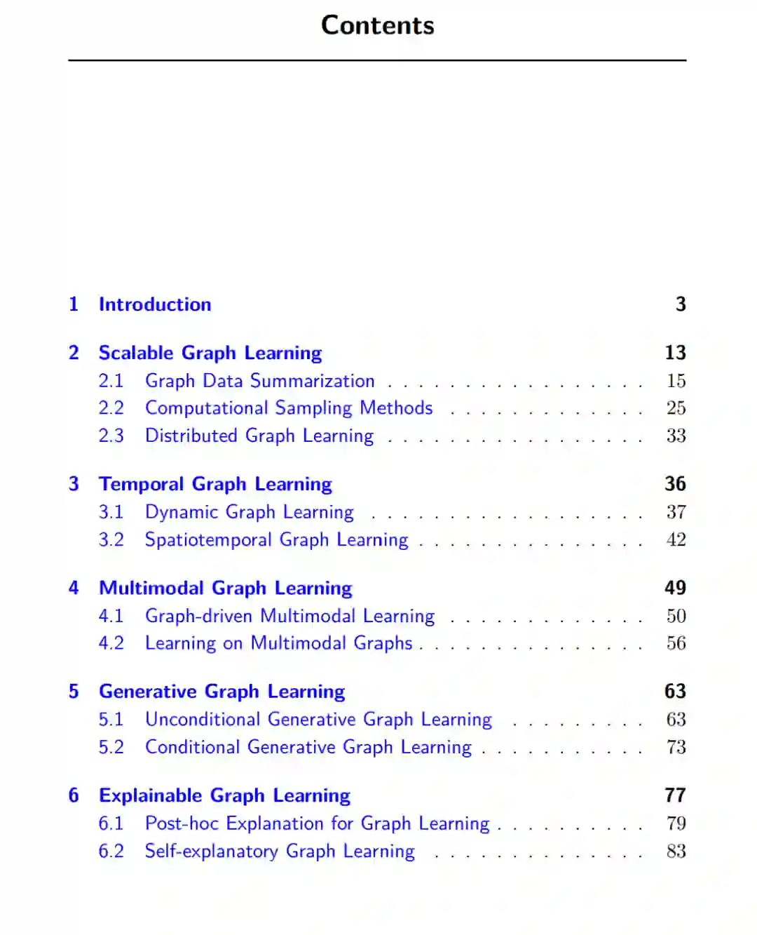 图学习之所以重要,是因为它能够建模复杂的非欧几里得关系,而这类关系通常难以被传统机器学习方法有效捕捉,从而更好地支持诸如药物发现、欺诈检测、推荐系统和科学推理等现实世界应用。然而,为了充分释放图学习的潜力,仍需解决一系列挑战,如可扩展性、泛化能力、异质性、可解释性以及可信性等问题。 本综述对图学习进行了全面介绍,重点关注以下几个关键维度:可扩展图学习、时序图学习、多模态图学习、生成式图学习、可解释图学习和负责任图学习。我们系统回顾了当前处理大规模图结构的高效技术、捕捉时序动态依赖关系的方法、异构数据模态的融合方式、新颖图样本的生成机制,以及提升可解释性以增强信任与透明度的研究进展。同时,我们还探讨了图学习模型在部署过程中所面临的伦理问题,如隐私保护与公平性,以促进其负责任地应用。