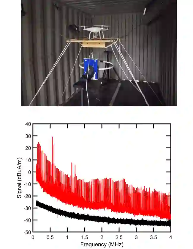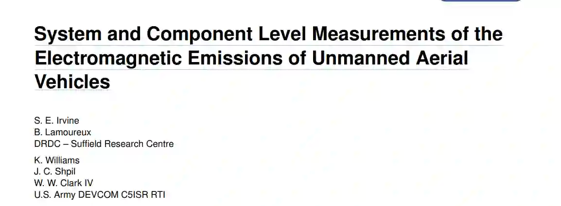 本科学报告介绍了加拿大国防研究与发展(DRDC)和美国陆军作战能力发展司令部指挥、控制、通信、计算机、网络、情报、监视和侦察(C5ISR)研究与技术集成(DEVCOM C5ISR RTI)在调查无人驾驶飞行器(UAV)电磁辐射方面所做的加拿大(CAN)-美国(USA)联合工作。这项研究的目的是量化这些辐射,并确定在无人飞行器上部署电磁传感器作为有效载荷可能面临的工程挑战。为此,我们选择了几种现成的商用系统和/或组件,并将其与一种实验仪器结合使用,该仪器设计用于记录 100 kHz 至 4 MHz 频率范围内的电磁噪声。使用两个独立的实验装置对 12 个不同的系统进行了测试。选择这些系统的依据不仅有可用性,还有外形尺寸(旋转翼和有翼)和燃料类型(电动电池、甲烷和汽油)。12 个无人机系统的电磁辐射首先在系统层面(即系统整体)进行采集。完成这项工作后,又进行了更深入的组件级分析,以确定无人机组件的噪声特性。结果表明,所有电池供电的无人机都会在整个相关频段内发出噪声,而且不同无人机之间的噪声差别很大。组件级分析表明,电机链产生了其中一种无人机(Stingray)的大部分(如果不是全部的话)观测到的辐射,这很可能可以推广到其他无人机系统。这是由于驱动无人机电机需要较大的调制电流。由于电池供电系统易于操作而受到青睐,因此必须开展进一步的工作,以确保可能作为有效载荷部署的传感器符合电磁标准。