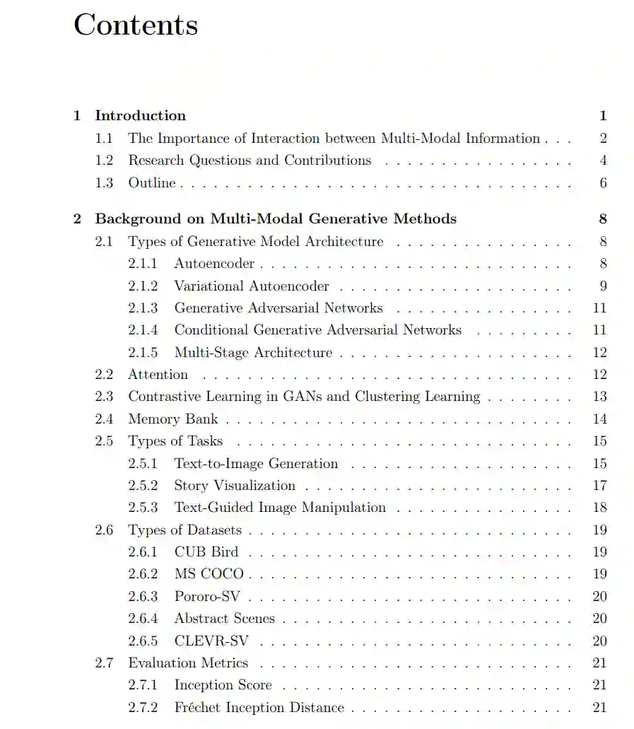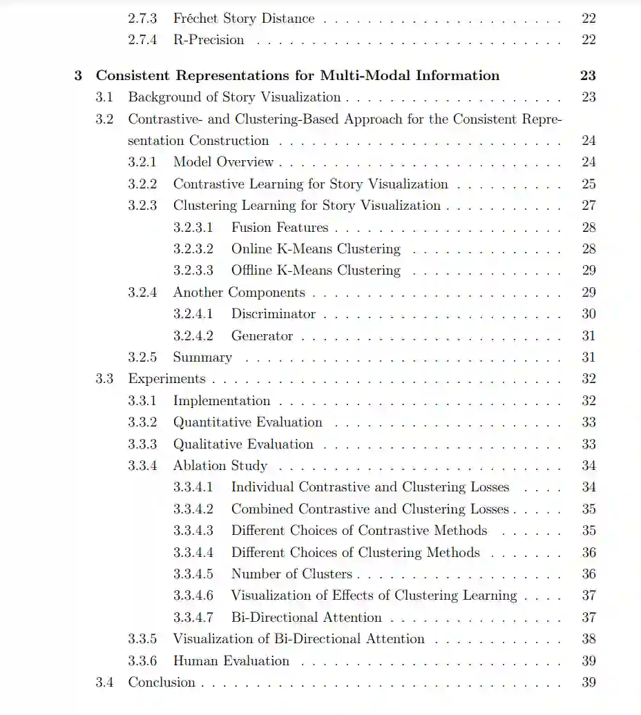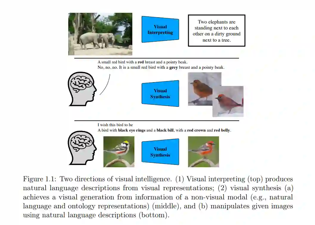 视觉感知是人类解释周围环境的最重要能力之一。每天,人类消耗的视觉信息量令人难以置信,他们观看视频、拍照、欣赏绘画以及在社交媒体上分享。例如,YouTube每天几乎有50亿视频被观看;仅Instagram每天就有超过9500万照片被上传。如此大量的视觉数据的可用性为研究人员提供了前所未有的机会来构建各种视觉解释和合成方法,如(1)物体/场景分类(He等,2016年;Simonyan和Zisserman,2014年;Szegedy等,2015年,2016年;Zhou等,2014年b),(2)物体检测(Girshick等,2014年;Long等,2015年;Ren等,2015年;Ronneberger等,2015年;Howard等,2017年;Redmon等,2016年),(3)图像描述(Donahue等,2015年;Xu等,2015年),(4)视觉问题回答(Andreas等,2016年;Johnson等,2017年;Lu等,2016年;Nam等,2017年;Antol等,2015年;Anderson等,2018年;Yang等,2016年),(5)文本到图像生成(Reed等,2016年b;Xu等,2018年;Zhang等,2017年a,2018年a),(6)图像到图像翻译(Isola等,2017年;Park等,2019年;Wang等,2018年;Zhu等,2017年),(7)文本引导的图像操作(Dong等,2017年;Li等,2020年a,c;Nam等,2018年),(8)故事可视化(Li等,2019年c;Song等,2020年;Maharana等,2021年;Maharana和Bansal,2021年)等等。这些方法旨在实现多模态表征之间的跨域转换,例如,将非视觉数据(如自然语言描述或场景图)转换成视觉信息(如视频或图像),反之亦然,并旨在实现它们之间的有效交互。 在这篇论文中,我专注于探索实现多模态信息(例如,语言和视觉信息)之间有效交互的原则,包括(1)如何在一个联合语义空间中为这些信息构建一致的表示,(2)如何有效地连接并融合来自不同模态的特征,以及(3)如何减轻计算需求以实现有效的交互。我的研究可以在许多领域启用无数潜在的应用,包括设计、视频游戏、艺术、建筑和医学诊断等等。