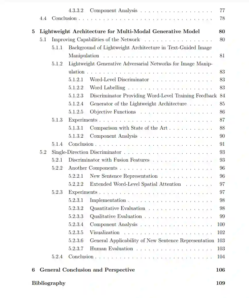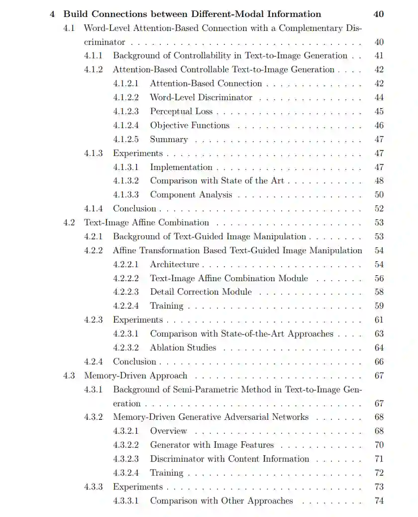 其次,为了实现多模态信息之间的有效关联,提出了三种不同的方法,有效地将图像视觉属性与相应的语义文本描述相关联,使网络学习理解文本和图像信息的语义意义,然后实现有效的交互。更特别的是,为了探索相关性,我首先研究了基于单词级别注意力的连接,并辅以补充的单词级别鉴别器,其中注意力允许网络学习识别与相应语义词对齐的特定图像视觉属性,而补充的单词级别鉴别器提供细粒度的训练反馈,以允许网络正确捕捉这种关联。然后,介绍了文本-图像仿射组合,采用仿射变换将文本和图像特征结合在生成过程中,使网络具有区域选择效应,有选择地将文本所需的图像属性融合到生成流程中,并保留与文本无关的内容。此外,提出了一种半参数的记忆驱动方法,它结合了参数技术和非参数技术的优点。非参数组成部分是一个存储库,由训练数据集构建而成的预处理信息库,而参数组成部分是一个神经网络。通过这样做,参数方法可以实现高度表达模型的端到端训练的好处,非参数技术允许网络在推理时充分利用大型数据集。