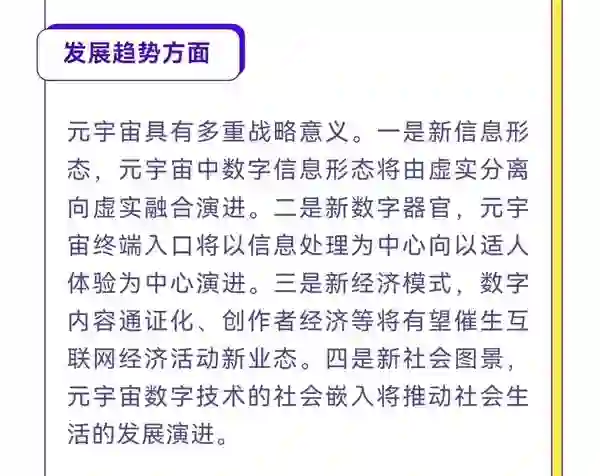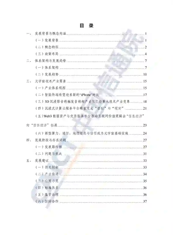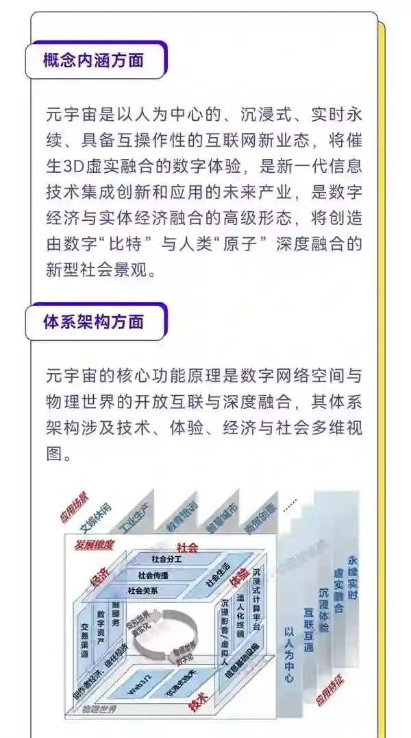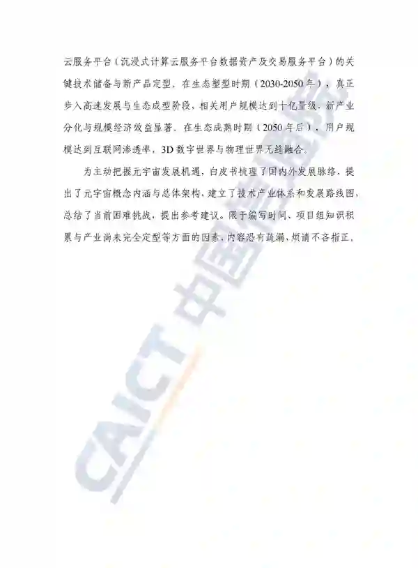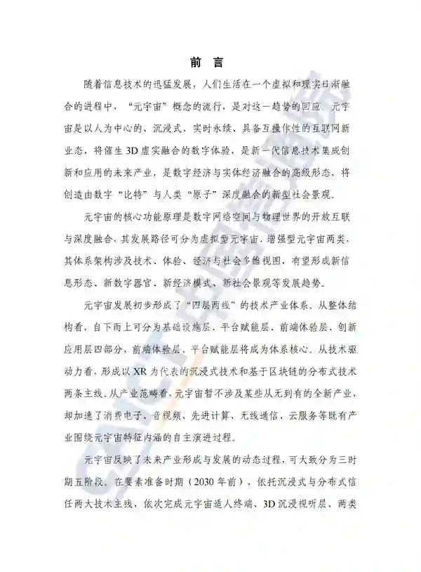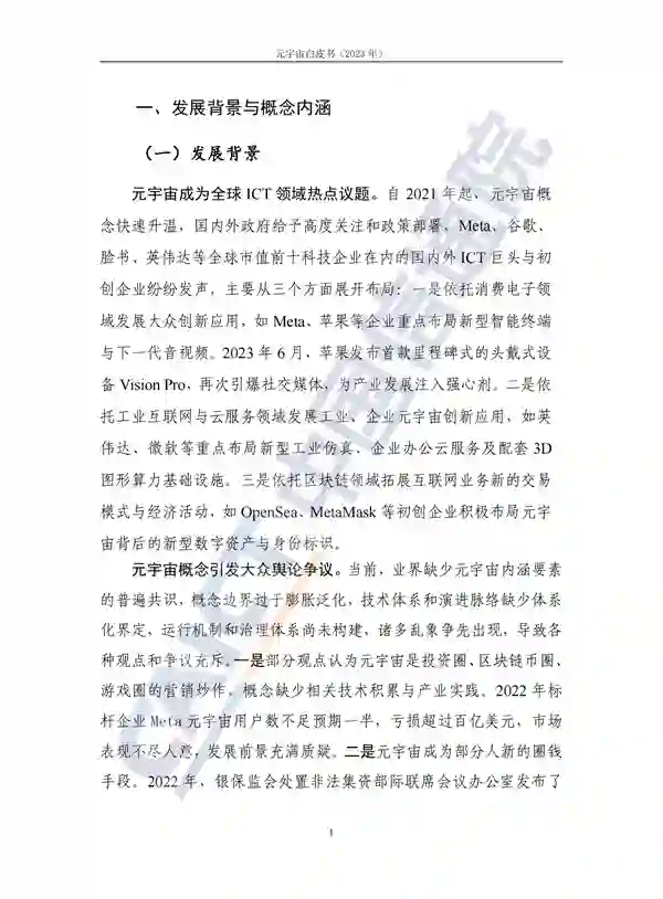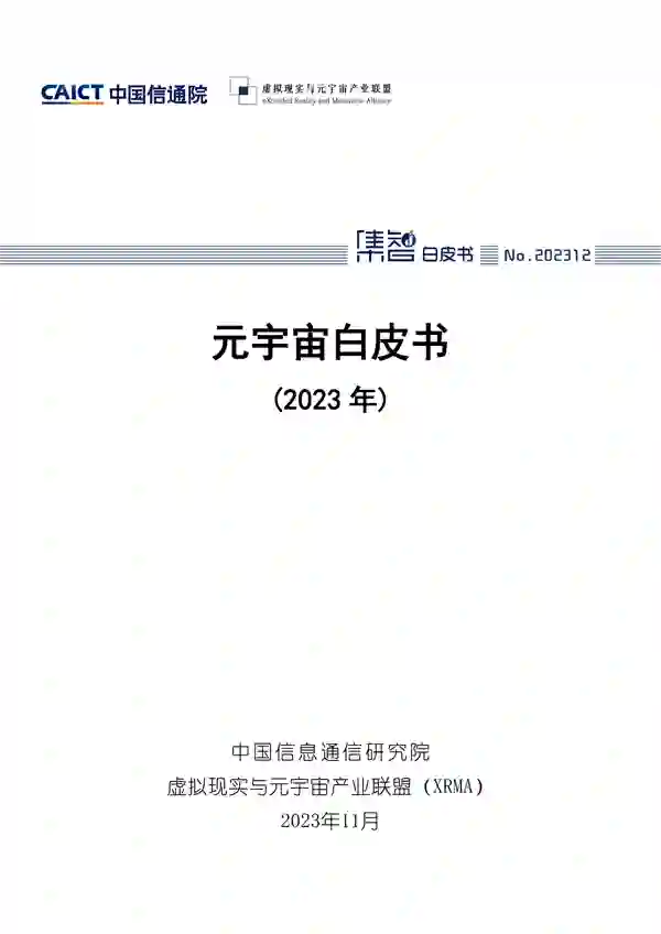 随着信息技术的迅猛发展,人们生活在一个虚拟和现实日渐融合的进程中,在此背景下,“元宇宙”概念迅速升温成为全球焦点议题,可能对人类生产生活方式产生较大影响。当前,国内外政府给予高度关注和政策部署,全球科技巨头与初创企业积极布局,抢抓元宇宙发展的新机遇、新赛道。 近日,中国信息通信研究院联合虚拟现实与元宇宙产业联盟(XRMA)正式发布《元宇宙白皮书(2023年)》。 白皮书在系统梳理国内外发展脉络基础上,构建了元宇宙发展的整体性视图,包括研究了元宇宙争议焦点和兴起动因,提出了概念内涵与总体架构,分析了发展趋势与价值意义,建立了技术产业体系和发展路线图,分析了当前面临困难和潜在挑战,并提出相关建议,面向业界和社会大众输出了相对全面的元宇宙发展视图和观点判断。 白皮书核心观点