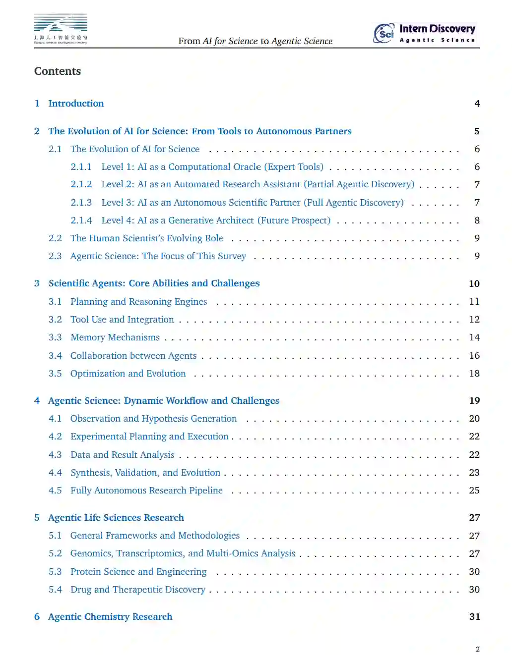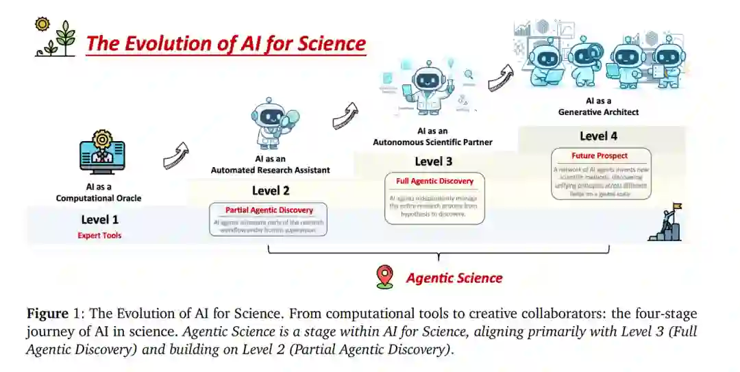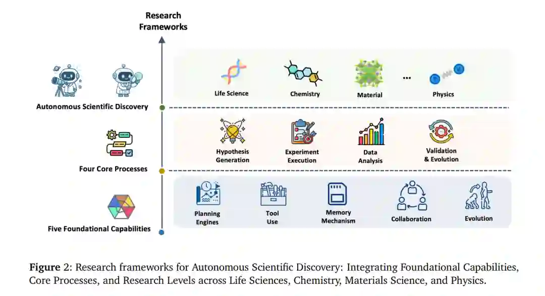 科学发现正经历着一场由人工智能(AI)快速演进所驱动的变革性转变,AI 的角色正在从专门化的工具转向科研合作者。这一进展标志着“AI for Science”范式中的关键阶段,即 AI 系统已从充当面向特定任务的计算“神谕”【121, 306, 339, 42, 87, 281, 351】逐步走向智能体科学(Agentic Science)的兴起(见图 1)【229, 220, 81, 274, 157】。智能体科学指的是“AI for Science”演化中的特定阶段——主要对应图 1 中的第 3 级(完全智能体化发现),其前身是第 2 级(部分智能体化发现)。在这一阶段,AI 作为自主科学智能体,能够独立提出假设、设计并执行实验、解释结果,并以更少的人类依赖性迭代完善理论【229, 22】。这种进展得益于诸如 Intern-Discovery 这样的综合平台(其提供了对多样化 AI 智能体和数据集的访问),以及 Intern-S1 等展现出深度科学推理能力的多模态模型。 这一转变受到基础模型(尤其是大语言模型,LLMs)【82, 256, 351】的最新突破所推动。LLMs 在自然语言理解、复杂推理和工具使用方面提供了前所未有的能力【245, 348, 323, 338, 337】,从而催生出能够超越静态学习流程的 AI 智能体。这类智能体不再仅是被动的模型,而是作为动态的、目标驱动的实体,能够自主探索科学方法【311, 89, 178, 358】。从假设生成【307, 209】,到自主实验【22, 317】,再到合成数据集的构建【150】,这些智能体展现出曾被认为仅属于人类的涌现行为。 与现有综述的比较。 尽管该领域发展迅速,但关于如何理解与设计日益自主化的科学系统,目前仍缺乏统一的框架。现有综述大体可分为三类互补视角。过程导向的综述试图将 LLM 的能力映射到经典的 与现有综述的比较。 尽管研究进展迅速,但关于如何理解和设计日益自主的科学系统,仍缺乏统一框架。现有综述可沿三条互补轴线加以归类:过程导向的视角将 LLM 的能力映射到经典研究循环【172, 352, 39】;自主性导向的研究依据系统的主动性与责任划分等级【346, 293】;机制导向的分析则剖析支撑智能体行为的架构基元及其演化角色【220, 331, 81, 274】。尽管这些工作奠定了重要基础,但仍然碎片化——往往将工作流程、自主性分级或体系结构彼此割裂开来单独考察。 我们的贡献。 有别于既有综述分别从过程、自主性或架构单点切入,本文通过图 2 所示的综合框架对上述视角进行统一与拓展,将自主科学发现中的基础能力—核心过程—领域实现贯通起来。我们围绕生命科学、化学、材料与物理四大领域,给出面向学科的自主科学发现综述,系统综合各学科的研究进展与代表性成果。该统一视角将智能体科学从一个抽象阶段提升为贯穿“能力—过程—应用”的结构化研究范式。我们的具体贡献如下: 1. 绘制 AI for Science 的演进图谱。 我们追溯了从“计算神谕”到“自主科研伙伴”的演进,形式化地将智能体科学界定为 AI 系统展现自主性、目标驱动推理与迭代学习的阶段。 1. 科学智能体的“机理解剖”:五大核心能力。 我们识别并分析科学智能体所需的五项基础能力:(i) 推理与规划,(ii) 工具整合,(iii) 记忆机制,(iv) 多智能体协作,以及 (v) 优化与进化。针对每一项能力,我们回顾最前沿的实现(如【169, 25, 189, 32】)与领域特定挑战。 1. 智能体科学的动态工作流:四个核心阶段。 我们将科学发现建模为由智能体驱动的动态四阶段工作流:(i) 观察与假设生成,(ii) 实验规划与执行,(iii) 数据与结果分析,(iv) 综合、验证与进化。我们强调,智能体可以灵活、动态地组合这些阶段以解决复杂科学问题【12, 22, 74, 73】。 1. 跨自然科学的系统综述。 我们在自然科学四大领域(见图 4:生命科学、化学、材料、物理)系统回顾智能体系统,覆盖十余个细分方向,从药物发现【317】到材料设计【113】,展示了智能体科学的广泛适用性与领域特定创新。 1. 挑战与未来机遇。 我们综合该领域面临的主要技术、伦理与哲学挑战——包括可复现性、新发现的验证与人—智能体协作——并提出研究路线图,以引导稳健、可信且具影响力的科学智能体的未来发展。