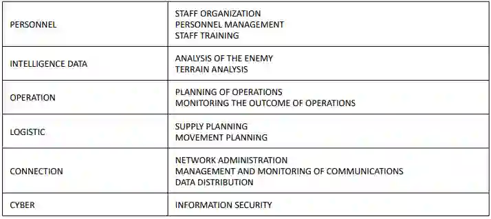 C5ISR 系统除了具备各种能力外,还有许多在战场上有用的功能。C5ISR 系统通过其工具不断收集和分类数据,以便在整个行动期间进行决策。它还包含用于战略决策过程的工具,可以生成 “作战命令”(战斗/行动命令),并生成命令,确定要采取的行动、采取所有行动的时间以及采取这些行动的活动地理区域。除这些功能外,它还具有模拟和预测敌军可能做出的反应并提供应对提示的功能。