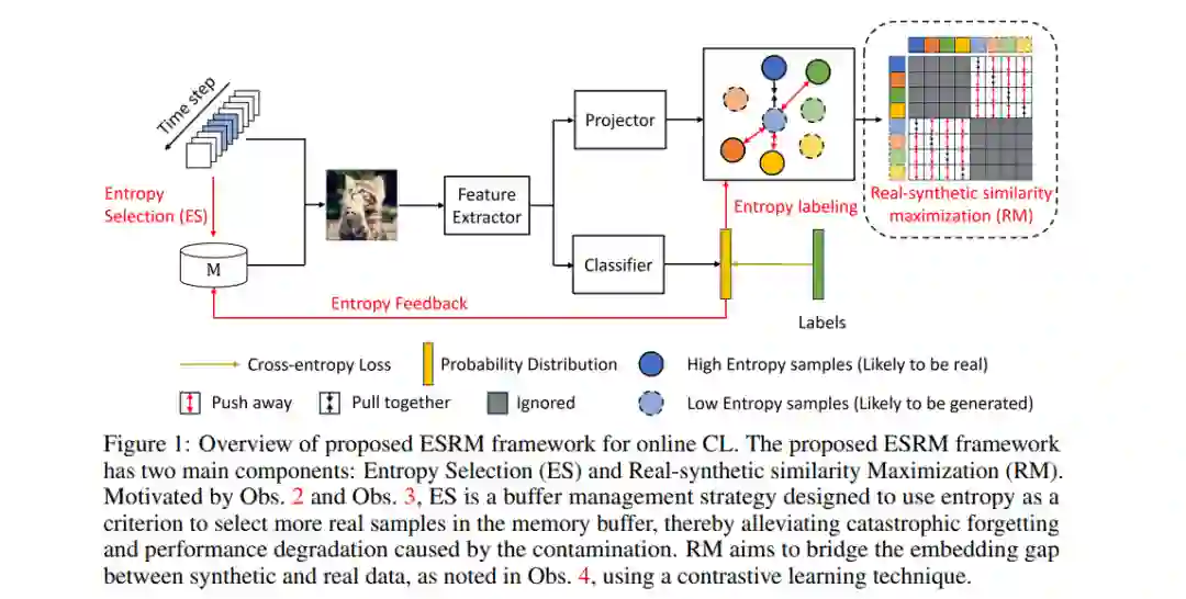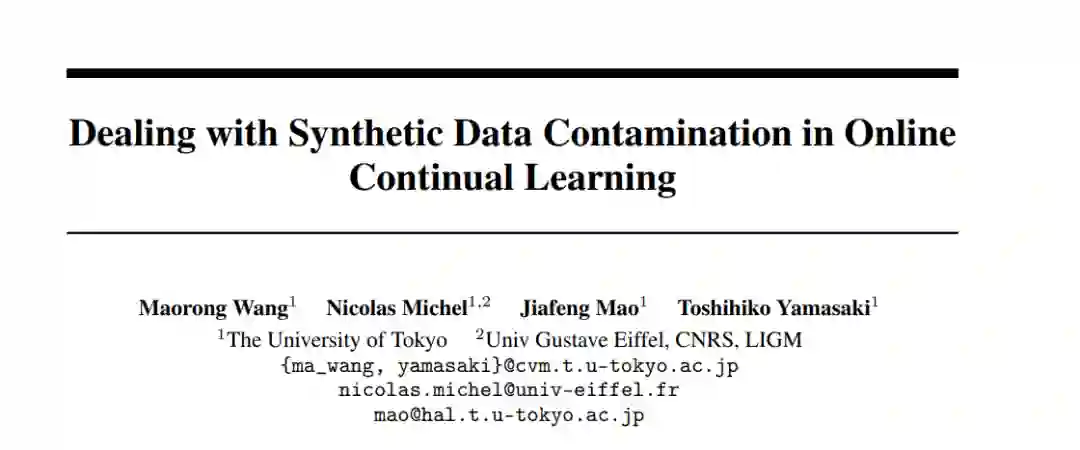 近年来,生成高保真真实感图像的能力取得了显著进展,特别是随着基于扩散模型(Diffusion-based Models)的技术发展。然而,人工智能生成图像(AI-generated images)的普及可能对机器学习社区带来尚未明确识别的副作用。同时,深度学习在计算机视觉领域的成功依赖于从互联网收集的大规模数据集。随着大量合成数据被添加到互联网上,未来研究人员可能难以收集到不含人工智能生成内容的“干净”数据集。已有研究表明,当训练数据集中包含合成图像污染时,模型的性能可能会显著下降。在本文中,我们探索了数据集污染对在线持续学习(Online Continual Learning, CL)研究的潜在影响。我们的实验结果表明,受污染的数据集可能阻碍现有在线CL方法的训练效果。为缓解合成图像对在线持续学习模型性能的负面影响,我们提出了一种新的方法:基于熵选择的真实-合成相似性最大化(Entropy Selection with Real-Synthetic Similarity Maximization, ESRM)。该方法的核心目标是在训练过程中减轻由合成图像污染导致的性能下降问题。实验结果表明,特别是在污染程度较高的情况下,我们的方法显著缓解了性能下降。为了保证可复现性,我们的工作源码已公开,地址为:https://github.com/maorong-wang/ESRM。