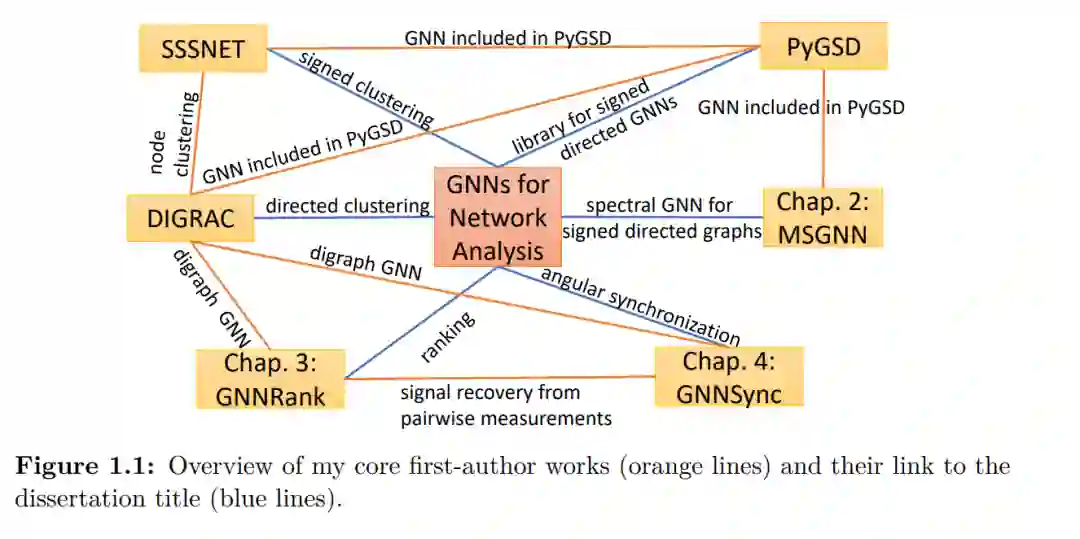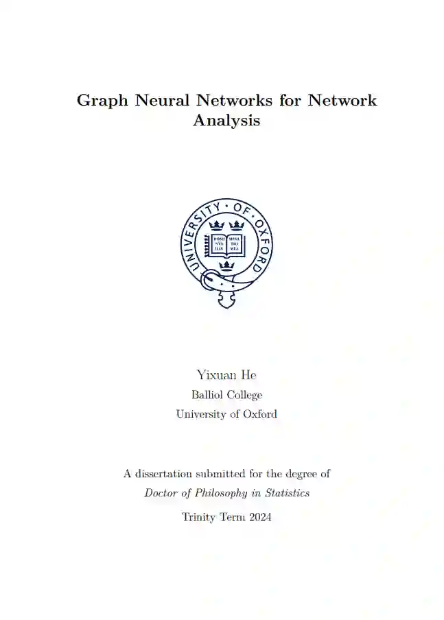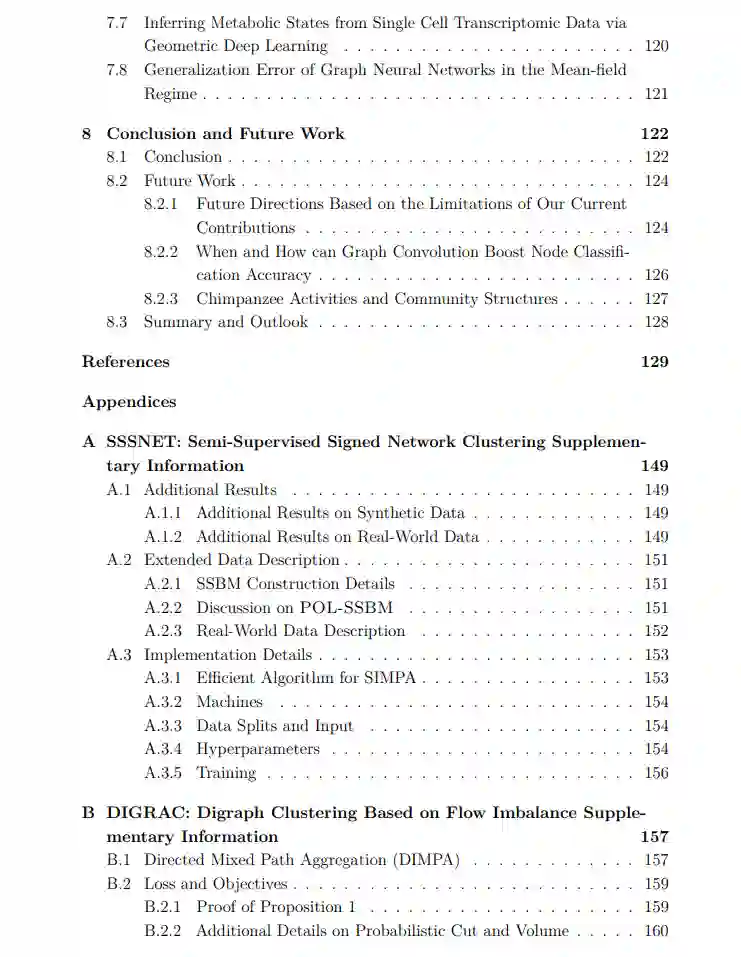 随着越来越多的数据来自非欧几里得领域,并以图的形式表示(如社交网络、引用网络和生物化学图),图数据因其丰富的关系信息,与许多学习任务相关联[1, 2]。需要从图数据中学习的任务包括预测蛋白质界面、分类疾病、学习分子指纹和建模物理系统[2]。虽然传统的网络分析通常集中于单一的固定简单网络,这些网络通常可以用具有非负条目的对称邻接矩阵表示,但更复杂的网络类型往往更具现实性。 为了解决网络推理任务,图神经网络(GNNs)是一种有用的工具。GNNs本质上是将深度学习应用于图数据。深度学习非常强大,因为神经网络是可训练的函数,用于进行预测。通常根据下游任务构建专用的损失函数,从而通过优化损失函数来更新神经网络参数。神经网络因此通常灵活易训练,并且往往能够达到令人满意的性能。利用标准的深度学习技术,如归一化、梯度下降和并行计算,GNNs可以像标准神经网络一样进行训练。通过利用网络结构,GNNs能够从具有长距离依赖的节点邻域中保留信息[2]。 GNNs有广泛的应用,如节点聚类、节点嵌入、链接预测、节点分类和时空图预测[1]。在本论文中,我们在复杂图中解决网络分析问题,通过结合任务的定制化应对特定领域的挑战。利用GNNs,我们能够通过将现有方法的输出作为输入或添加可学习参数来改进现有方法。以这种方式,我们的GNNs可以被视为对非GNN方法(通常是谱方法)的改进,这些方法无法自然地使用外部信息。