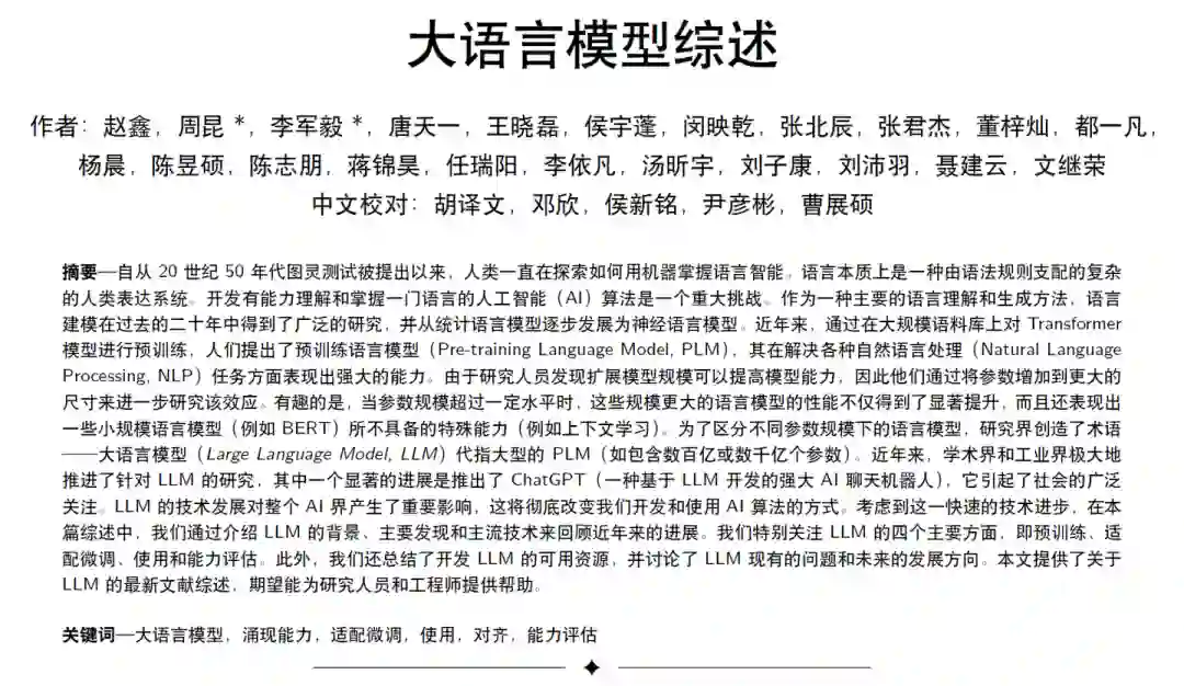 今年3月末,我们在 arXiv 网站发布了英文版大语言模型综述文章《A Survey of Large Language Models》,该综述文章系统性地梳理了大语言模型的研究进展与核心技术,讨论了大量的相关工作。今年 6 月底,为了提升该综述的质量,我们进行了大规模修订,目前版本号目前迭代到 V11。