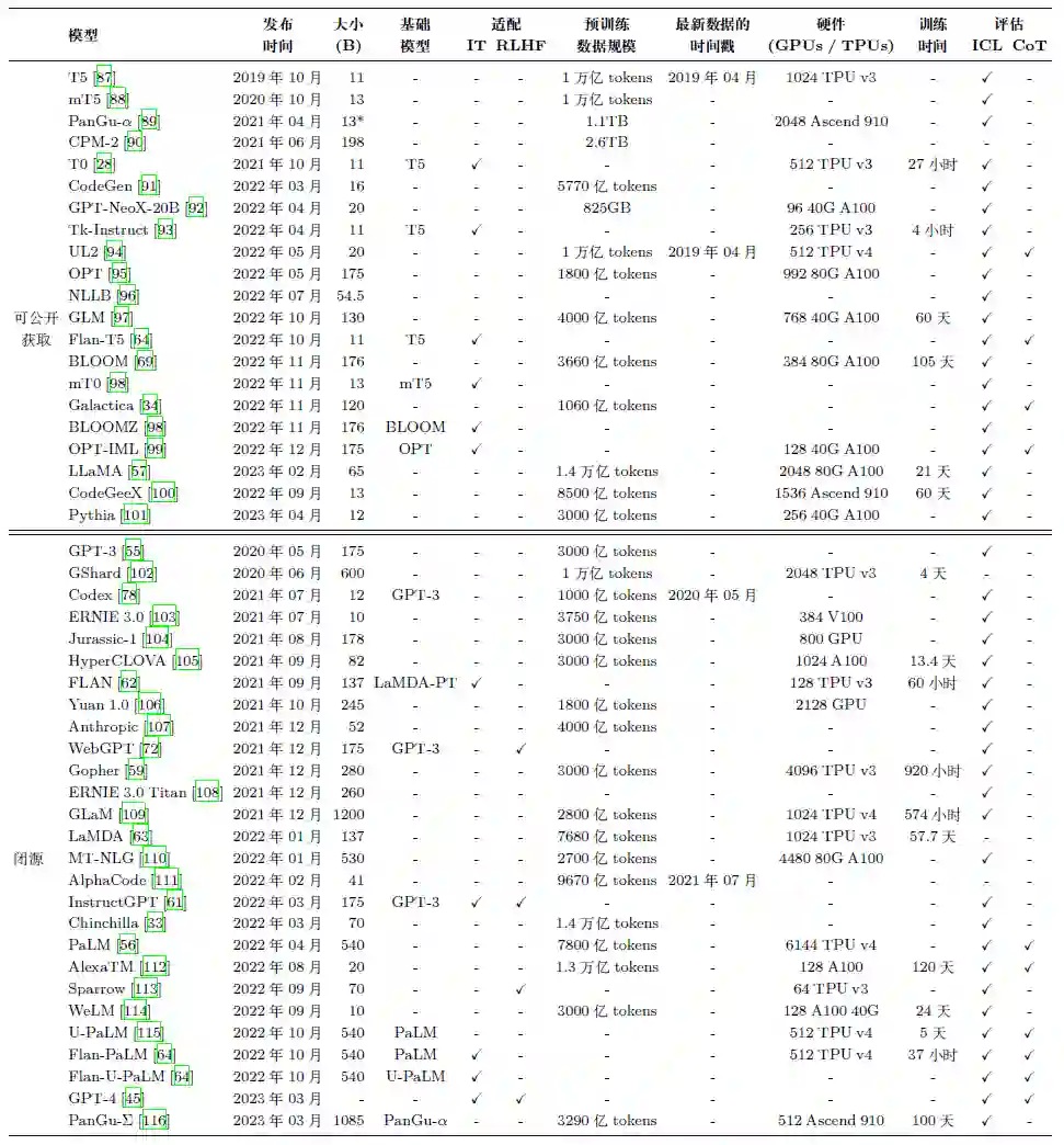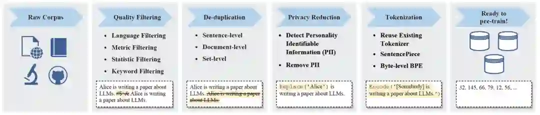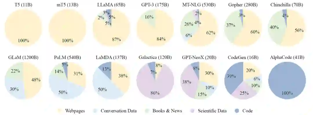 一个典型的预处理预训练数据的流程图 近年来 LLM(指规模大于 100 亿的模型)的统计数据,包括评估、预训练数据规模(以 token 数量或存储大小表示)和硬件