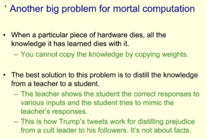 首先,让我们来看看传统的计算方式。计算机的设计原则是要能精准地执行指令,也就是说如果我们在不同的硬件上运行相同的程序(不管是不是神经网络),那么效果应该是一样的。这就意味着程序中包含的知识(如神经网络的权重)是不朽的,与具体的硬件没有关系。