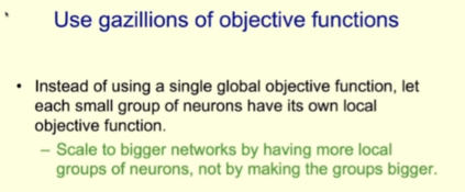 第一种方法是使用巨量目标函数,也就是说不使用单个函数来定义大型神经网络的目标,而是使用大量函数来定义网络中不同神经元集团的局部目标。