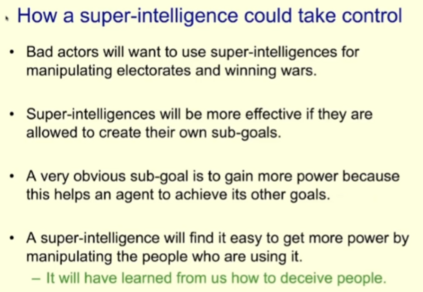 一旦超级智能学会了欺骗人类,它就能让人类去进行它想要的行为。这和人骗人其实没有本质区别。Hinton 举例说,如果某人想要入侵华盛顿的某栋大楼,他其实无需亲自前去,他只需要欺骗人们,让他们相信入侵这栋大楼是为了拯救民主。