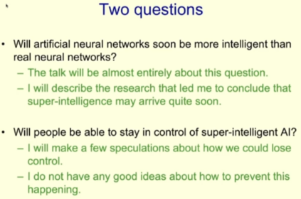演讲一开始,Hinton 便宣称,超级智能(superintelligence)诞生的时间可能会比他曾经想象的早得多。这一观察引出了两大问题:(1)人工神经网络的智能水平将会很快超越真实神经网络吗?(2)人类是否能保证对超级 AI 的控制?在大会演讲中,他详细讨论了第一个问题;针对第二个问题,Hinton 在演讲的最后表示:超级智能可能将很快到来。