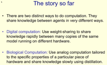 而如果使用模拟计算呢?我们可以将神经活动视为电压,将权重视为电导;那么每一单位时间里,电压乘以电导可得到电荷,电荷可以叠加。这种工作方式的能效会高很多,而且其实现在已经存在这样工作的芯片了。但很不幸,Hinton 表示,现在人们还是要使用非常昂贵的转换器将模拟形式的结果转换成数字形式。他希望以后我们能在模拟领域完成整个计算过程。