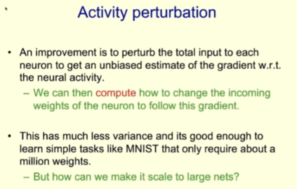 与权重扰动相比,活动扰动的噪声要小得多。并且这种方法已经足以学习 MNIST 这样的简单任务。如果你使用非常小的学习率,那么它的行为就与反向传播完全一样,但速度要慢得多。而如果学习率较大,那么噪声会很多,但也足够应对 MNIST 这样的任务。