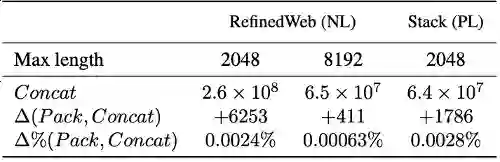 基于在自然语言(RefinedWeb) 和编程语言(The Stack) 数据集上的实验,我们发现最佳适配打包显著降低了文本截断。 值得注意的是,大多数文档包含的token数少于2048个;由于传统拼接-分块时造成的截断主要发生在这一范围内,而最佳适配打包不会截断任何长度低于L的文档,由此有效地保持了绝大多数文档的完整性。