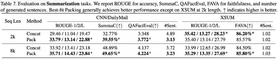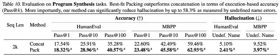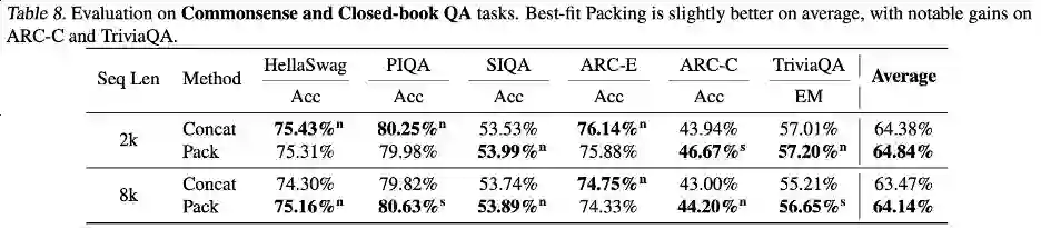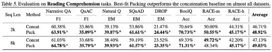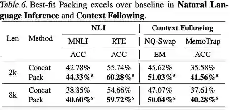 实验结果表明,使用最佳适配打包在在一系列任务中提升了模型性能,尤其是在阅读理解 (+4.7%)、自然语言推理 (+9.3%)、上下文跟随 (+16.8%) 和程序合成 (+15.0%) 等任务中表现显著(由于不同任务的度量标准的规模各异,作者默认使用相对改进来描述结果。) 经过统计检验,研究者发现所有结果要么统计显著地优于基线(标记为s),要么与基线持平(标记为n),且在所有评测的任务中,使用最佳适配打包均未观察到性能显著下降。 这一一致性和单调性的提升突显了最佳适配打包不仅能提升模型的整体表现,还能保证在不同任务和条件下的稳定性。详细的结果和讨论请参考正文。